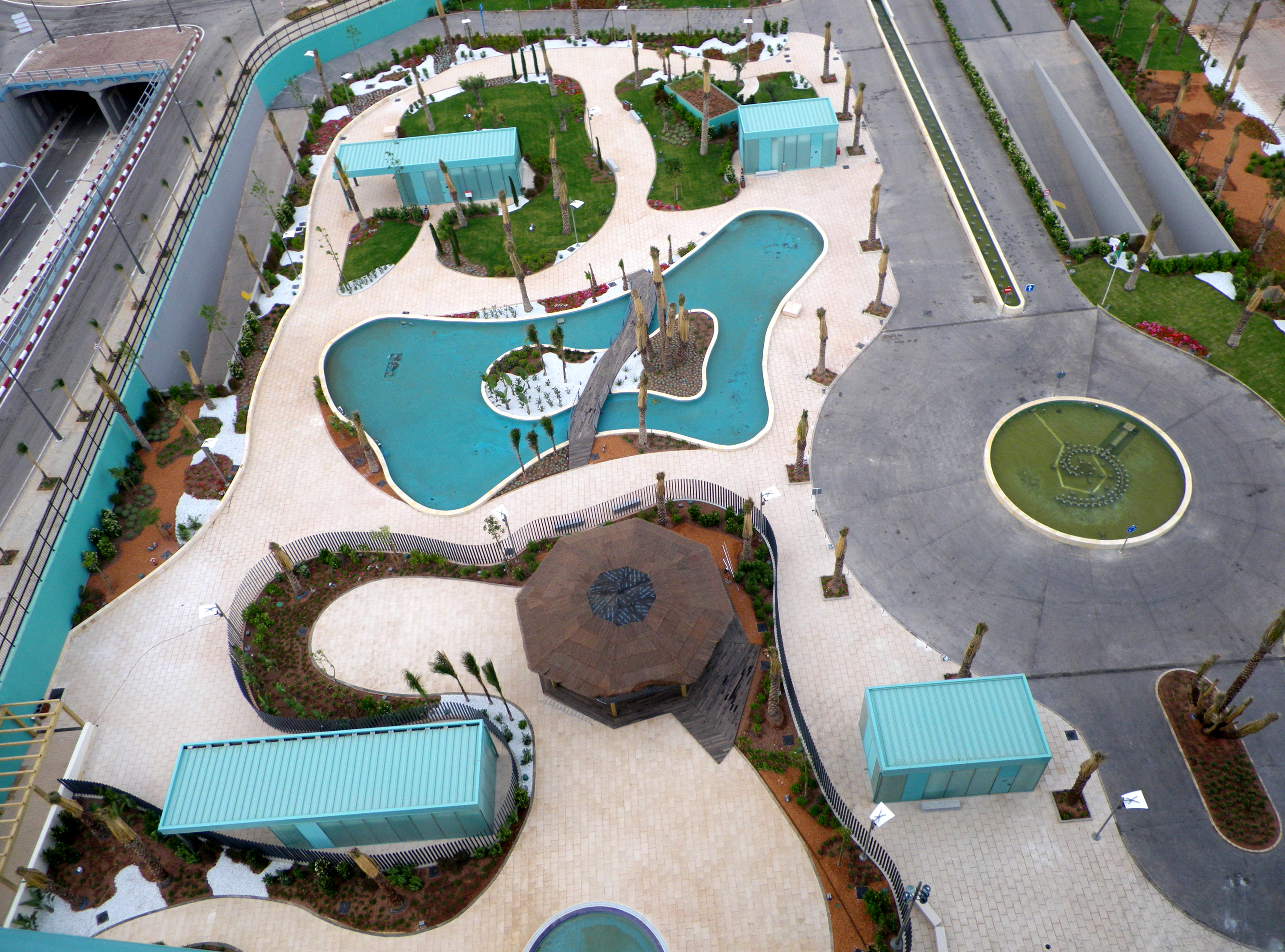 This impressive view from the hotel rooms across the gardens gives a particularly good sense of the architectural concept with its circular features and curved lines, Photo: ZinCo
