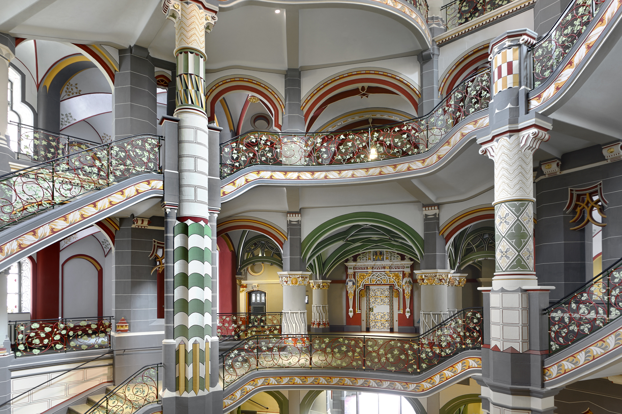 Das polychrom gefasste Treppenhaus, Foto: Caparol Farben Lacke Bautenschutz/Udo Stieglitz