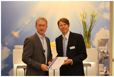 Zertifikatsübergabe auf der Intersolar Europe 2014: Damian Dillon von Hareon Solar links) und Stefan Vitz von TÜV SÜD