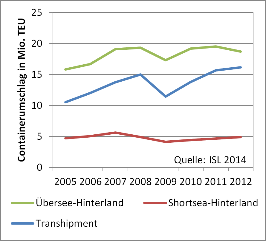 Entwicklung des Containerumschlags der Nordrangehäfen nach Marktsegmenten 2005-2012