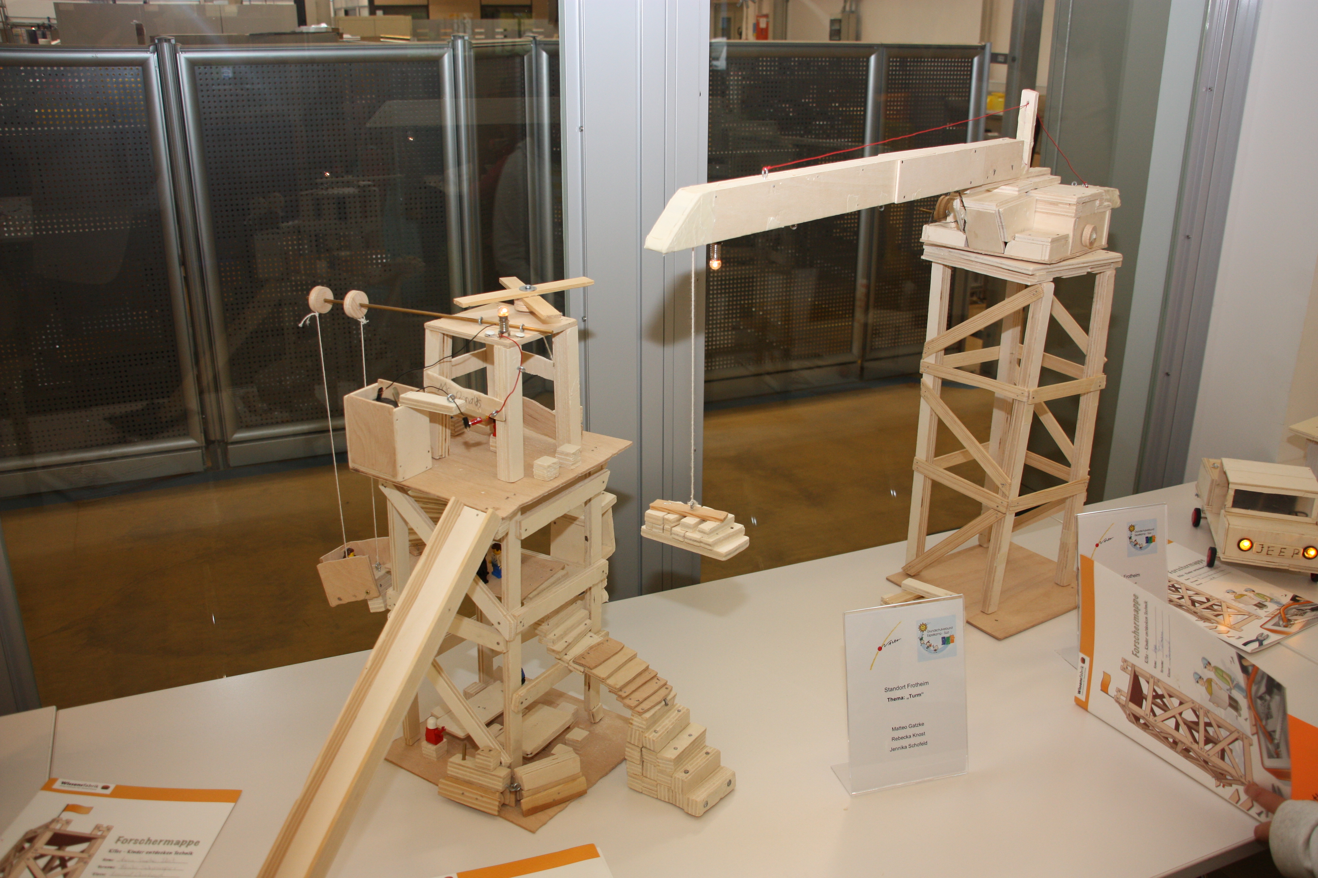 Diese beiden Projekte belegten den ersten und zweiten Platz des HARTING Forscherpreises: Ein Turm mit raffinierten Extras (links; erster Platz) sowie ein funktionstüchtiger Kran (rechts)