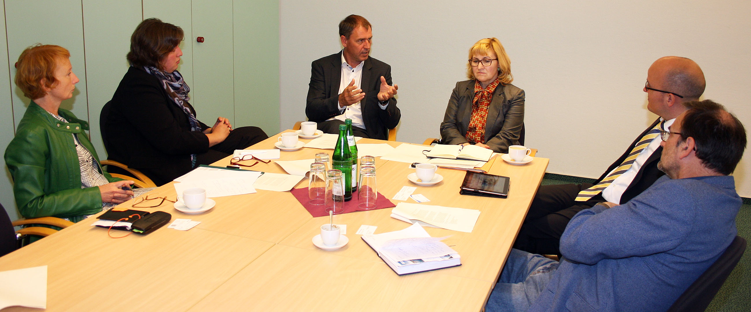 Gute Gespräche: (v.l.) Dr. Monika Budde und Prof. Dr. Maike Busker von der Universität Flensburg, Thomas Andresen, Bürgermeister Apenrade, die Flensburger Stadtpräsidentin Swetlana Kretschmer, Prof. Dr. Bosco Lehr vom Institut für eHealth und Management im Gesundheitswesen und Dr. Klaus von Stackelberg, Vizepräsident der FH (Foto: Gatermann)