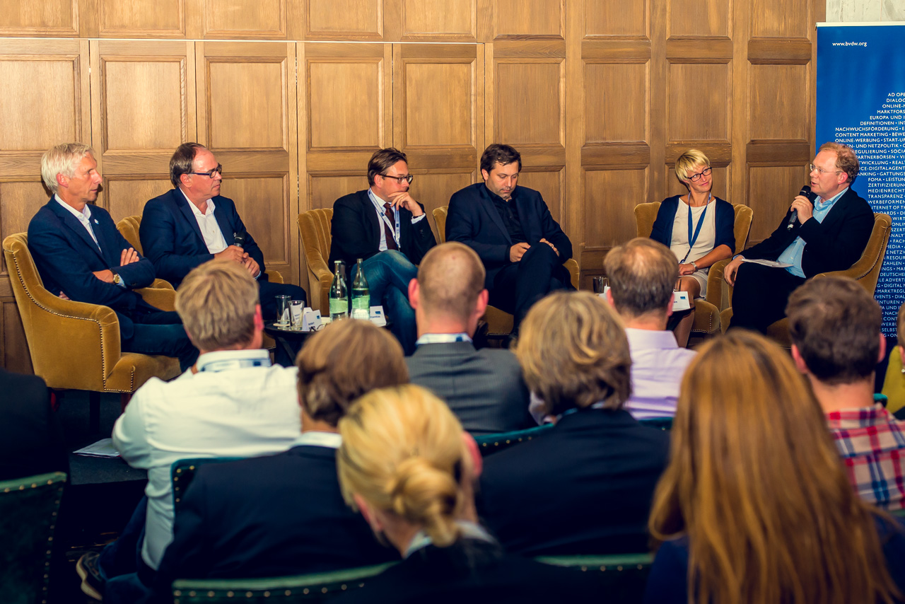 Herbert Behrens (Die Linke), BVDW-Präsident Matthias Ehrlich, Konstantin von Notz (Bündnis 90/Die Grünen), Lars Klingbeil (SPD), Nadine Schön (CDU), Sebastian Turner (Moderator des Panels)