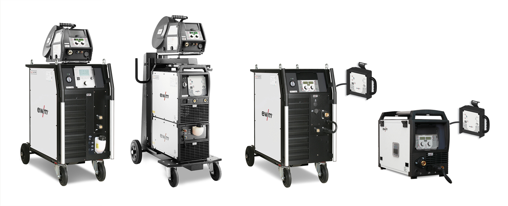 Der Anwender kann die Qualitätssicherungssoftware ewm Xnet entweder über die Steuerung Expert 2.0 in LAN/WiFi Ausführung (links), bei der Progress-Gerätesteuerung über das eingebaute LAN/WiFi Gateway (Mitte links) oder zum Beispiel bei kompakten MIG/MAG- und WIG-Geräten über das LAN/WiFi Gateway im externen Gehäuse (Mitte rechts und rechts) nutzen (Foto: EWM AG)