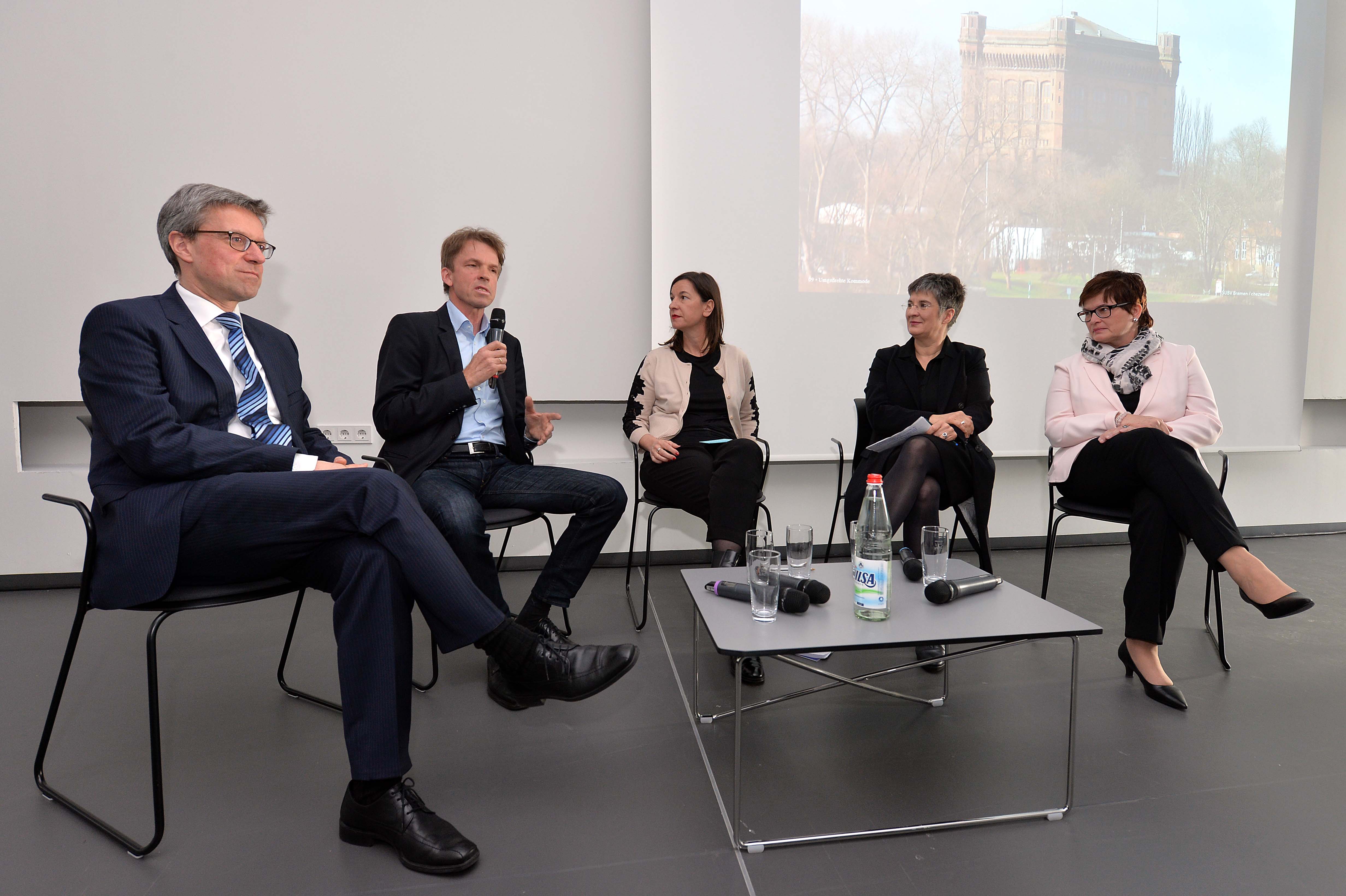 Von links nach rechts: Dr. Matthias Fonger, Hauptgeschäftsführer der Handelskammer Bremen, Prof. Dr. Ingo Mose (Sprecher des Beirates Neustadt), Dr. Sonja Beeck (Moderation), Senatsbaudirektorin Prof. Dr. Iris Reuther und Rektorin Prof. Dr. Karin Luckey (Fotograf: Michael Bahlo)