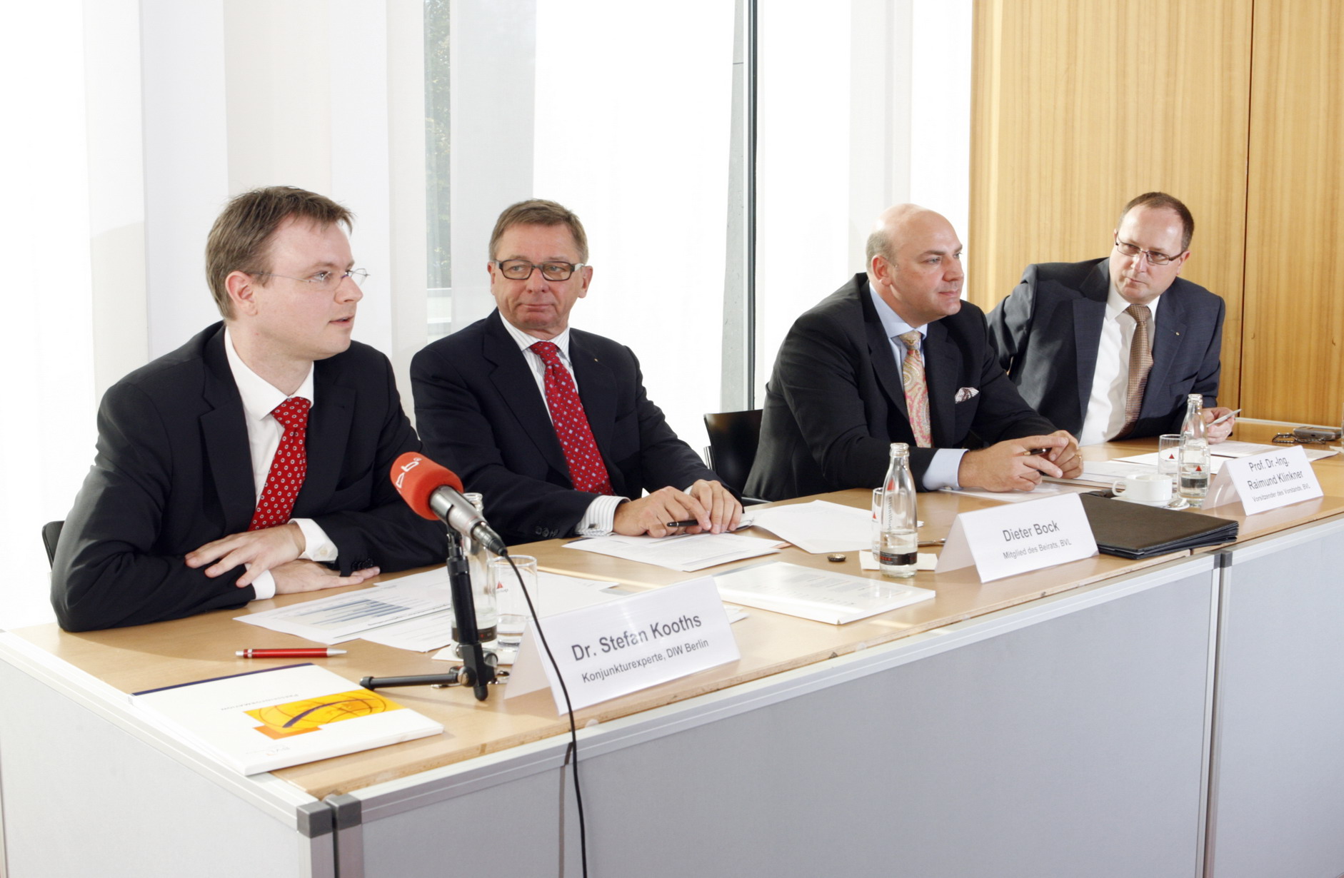 Dieter Bock, Mitglied des Beirats der BVL, Prof. Dr.-Ing. Raimund Klinkner, Vorsitzender des Vorstands der BVL, Dr. Stefan Kooths, Konjunkturexperte DIW Berlin, Dr.-Ing. Thomas Wimmer, Vorsitzender der Geschäftsführung der BVL