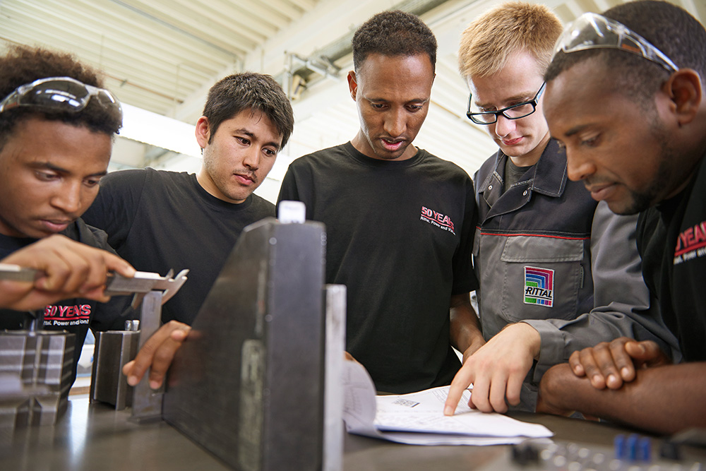 Das Azubi-Patenmodell hat sich bewährt: Den Praktikanten sind Auszubildende als Paten zugeteilt. Gemeinsam lernen sie nicht nur Bohren oder Fräsen, sondern erweitern auch ihre Deutsch- und Fußballkenntnisse. Quelle Rittal GmbH & Co. KG