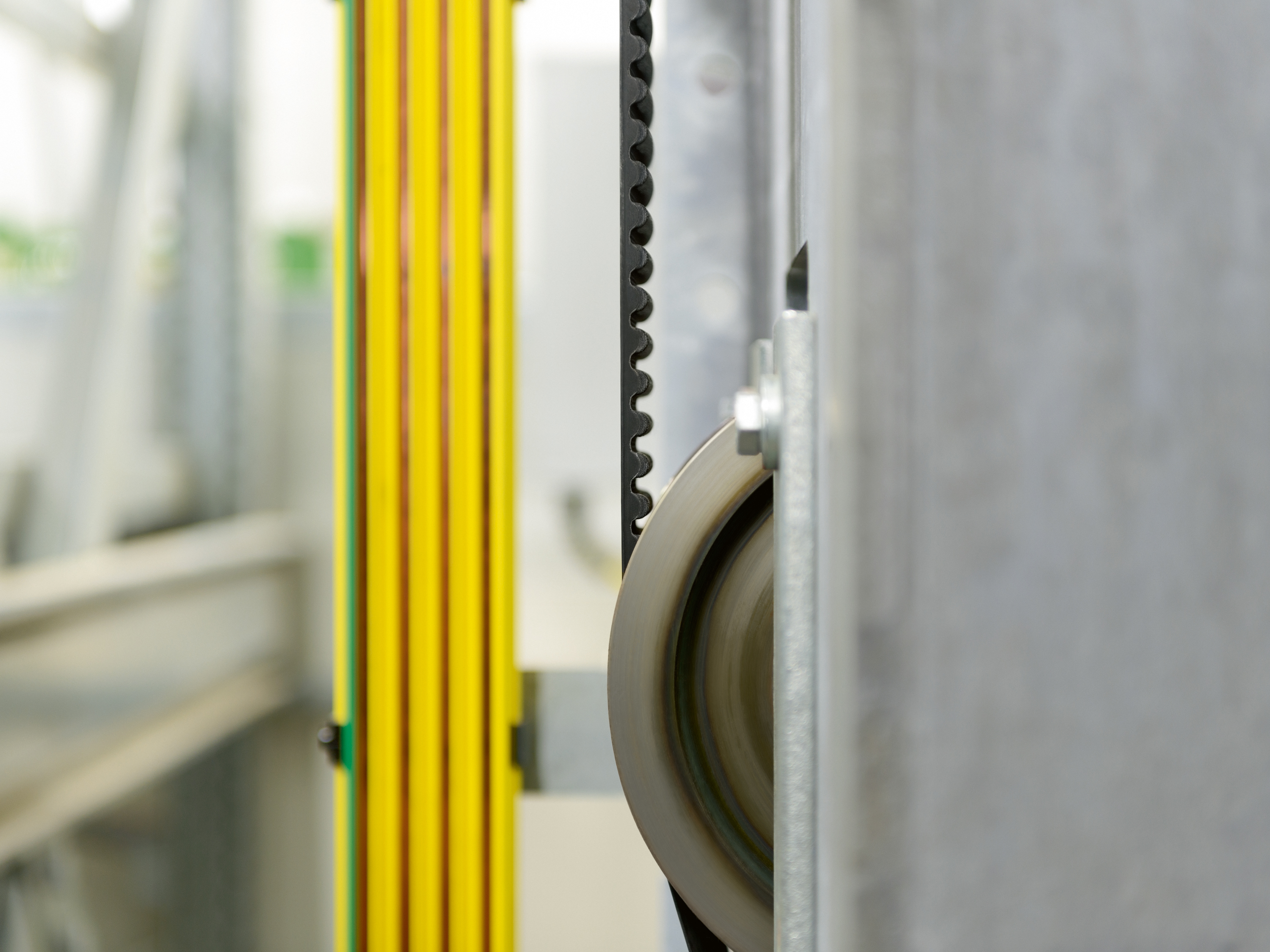 Minimierter Verschleiß, geringere Wartung, optimierte Positionierzeiten: Die neue Technologie für den Hubantrieb von Regalbediengeräten arbeitet mit Zahnriemen von ContiTech / Foto: LTW Intralogistics GmbH