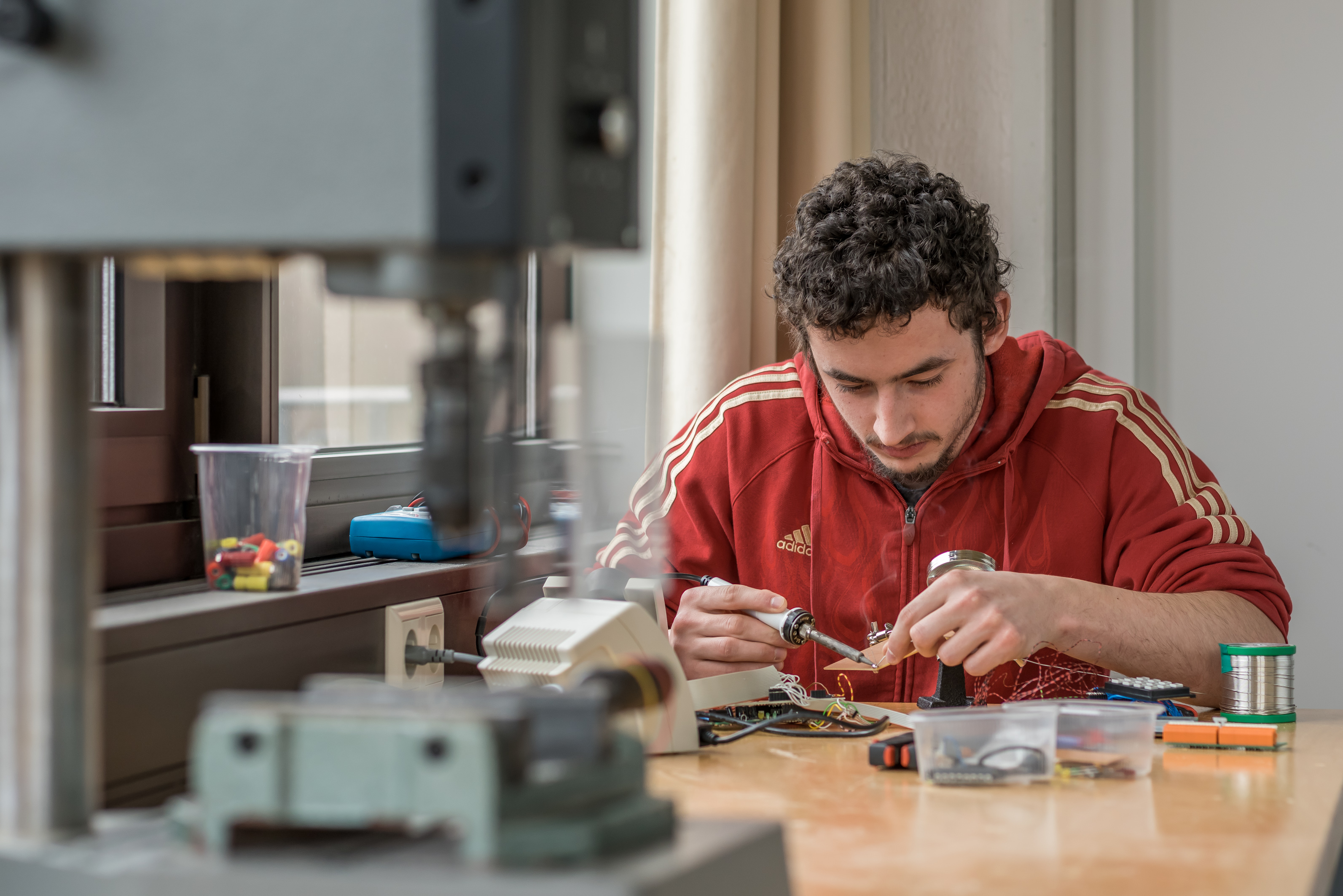 Tristan Eberle im TICK-Werksraum am Campus Künzelsau der Hochschule Heilbronn. Dort arbeitet er an seinem Projekt.