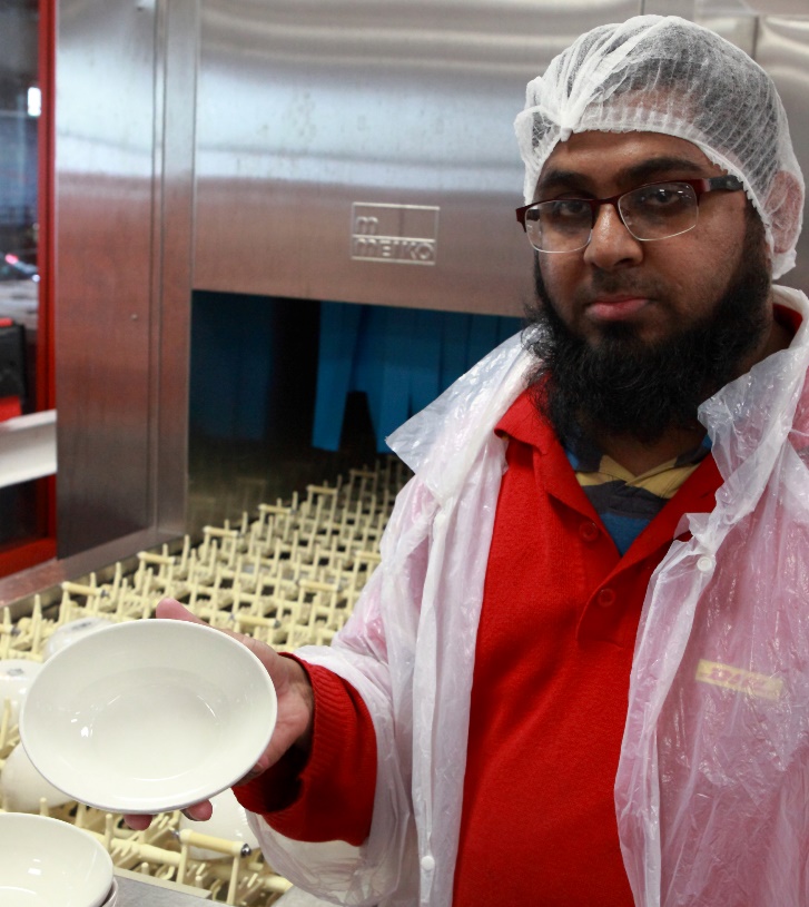 Glänzend sauberes Geschirr kommt aus der Bandgeschirrspülmaschine M-iQ