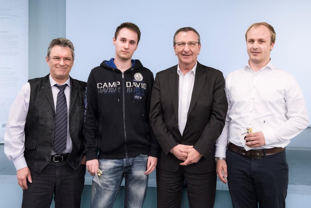 Arbeitsdirektor Thomas Schlenz und Klaus-Peter Lesch (links) vom Technikzentrum Duisburg gratulieren den Jahrgangsbesten Patrick Bobel (zweiter von links) und Yannick Kettler (rechts). Beide hatten ihre Abschlussprüfung mit sehr gut bestanden