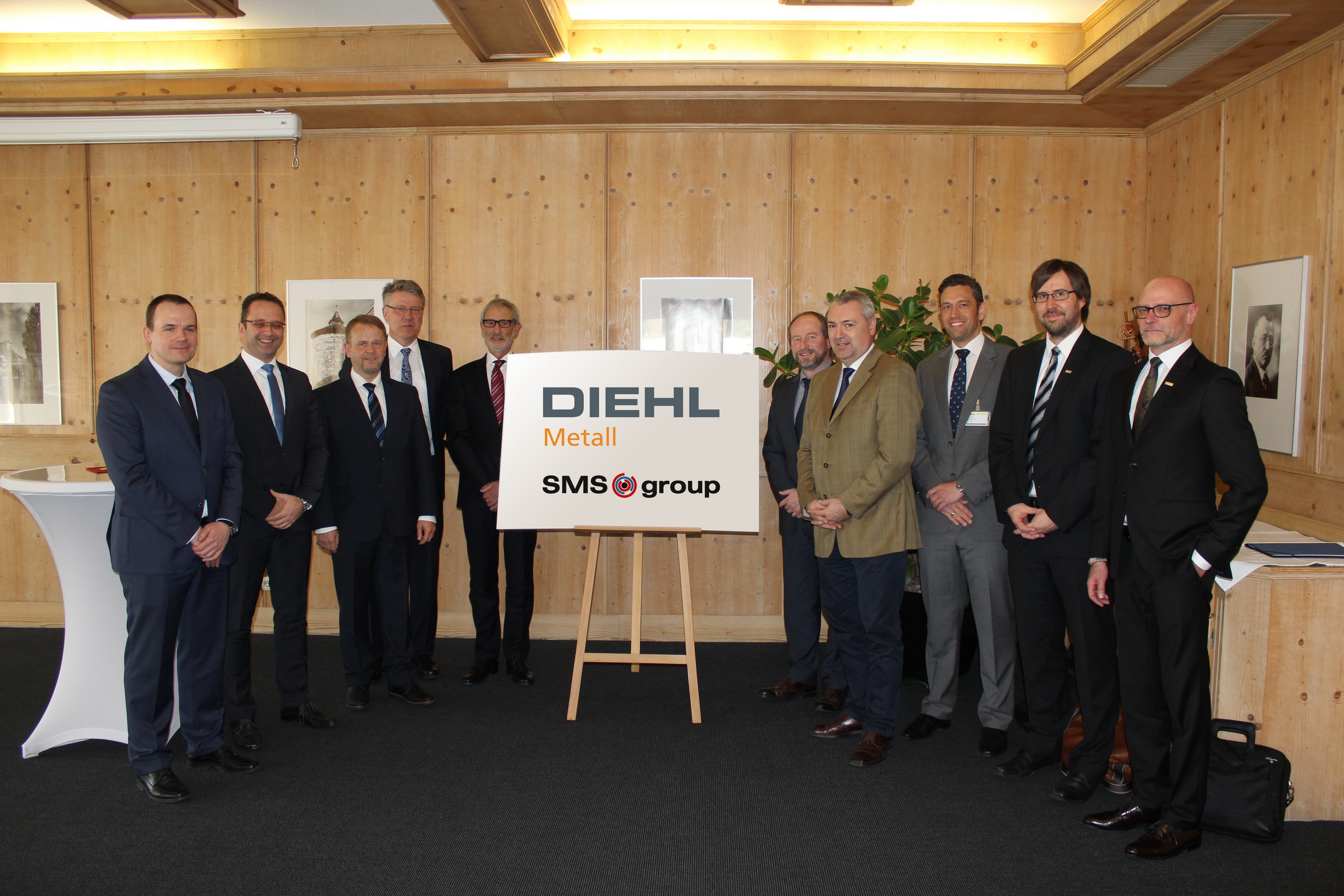Von links nach rechts: Dr. Hansjörg Hoppe (SMS group), Günther Ernst (Diehl), Heinz Strobl (Diehl), Rainer Wehn (Mitglied des Bereichsvorstandes Diehl Metall), Ulrich Vohskämper (Leiter Geschäftsbereich Forging Plants der SMS group), Frank Termöllen (Diehl), Ulf Höltge (SMS group), Marco Hahner (SMS group), Thomas Kuncz (Diehl), Norbert Bürger (Diehl) nach der Vertragsunterzeichnung