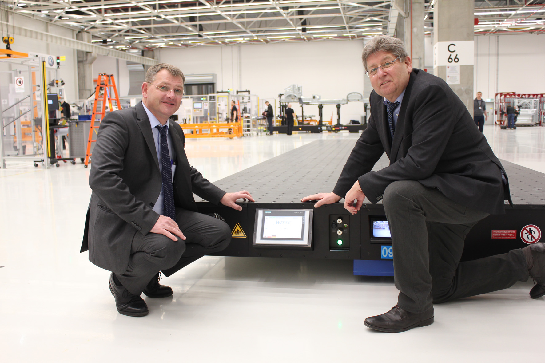 Werner Steinert (links), Leiter Messtechnik im VW-Werk Września, und Andreas Witte, Geschäftsführer des gleichnamigen Unternehmens, weisen darauf hin, dass die Transportplatten durch die Siemenssteuerung und integrierte Systeme eine Intelligenz aufweisen, die ein sicheres autarkes Fahren möglich macht