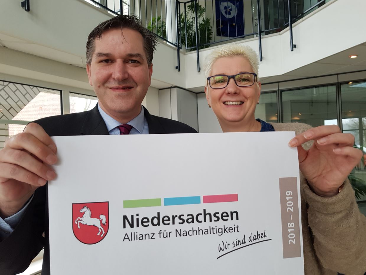 Die Vorreiter-Rolle des Ankumer Softwarehauses HANSALOG wird durch die Auszeichnung der Niedersachsen Allianz für Nachhaltigkeit gewürdigt. Stolz präsentiert die HANSALOG Geschäftsleitung das Banner "Wir sind dabei"