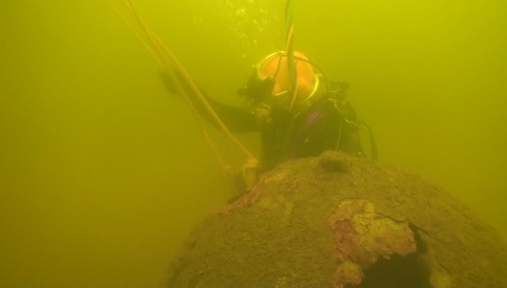 Helmtaucher an Ankertaumine; Quelle: Landeskriminalamt Schleswig Holstein – Kampfmittelräumdienst, 2012
