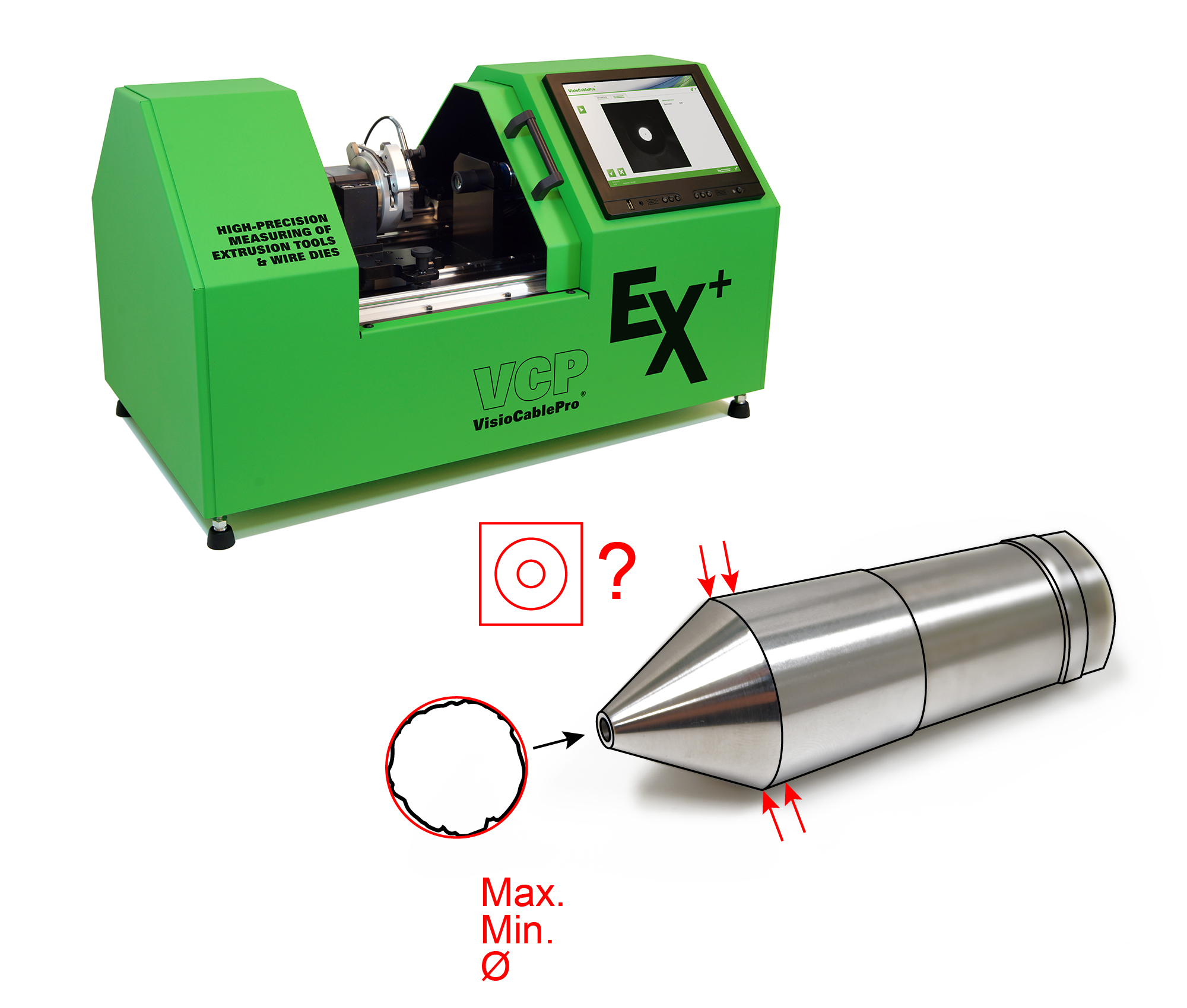 Abbildung 1 Mögliche Messergebnisse des VCPEx+: minimaler, maximaler und mittlerer Innendurchmesser, Rundlauf, Zentrizität / Konzentrizität
