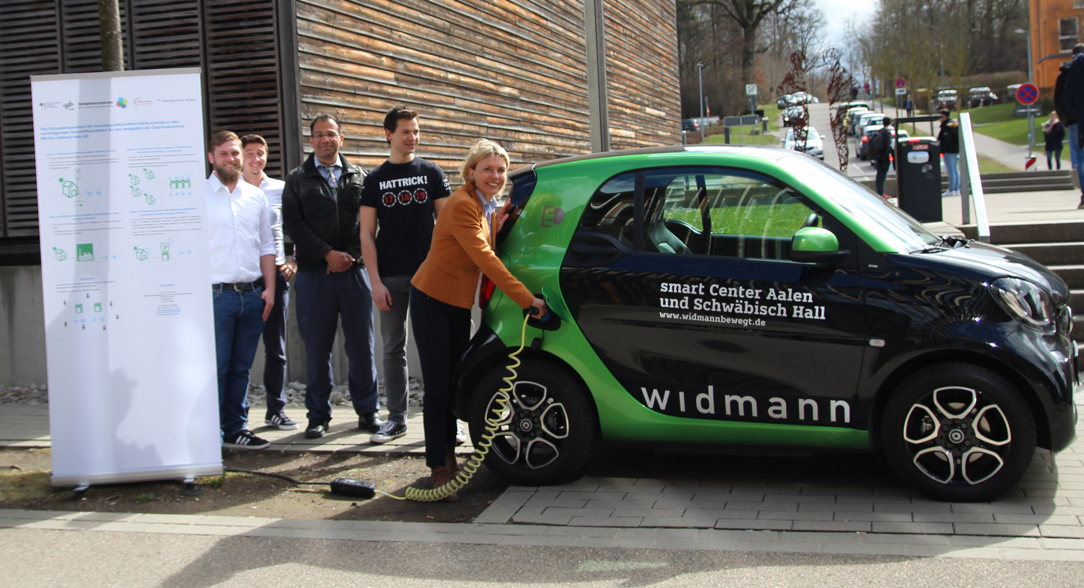 Das Kompetenzzentrum für innovative Geschäftsmodelle der Hochschule Aalen (von rechts nach links): Prof. Dr. Anna Nagl, Martin Meidinger, Prof. Dr. Winfried Bantel, Peter Hoch und Kevin Braun freuen sich über den neuen E-Smart. Bild: © Hochschule Aalen/ Pia Heusel