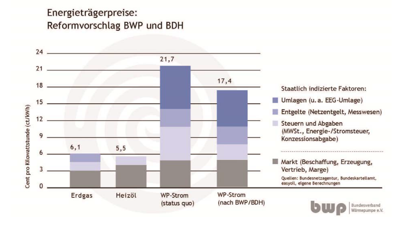 Wärmepumpen‐Nutzer zahlen die volle EEG‐Umlage und leisten so einen Beitrag zur Finanzierung der Energiewende. Heizöl, ein Hauptverursacher der globalen Erderwärmung, wird gar nicht beteiligt. Bei Umsetzung der Forderungen in der Banzer Erklärung ließe sich der Preis für Wärmepumpenstrom um ein Fünftel senken
