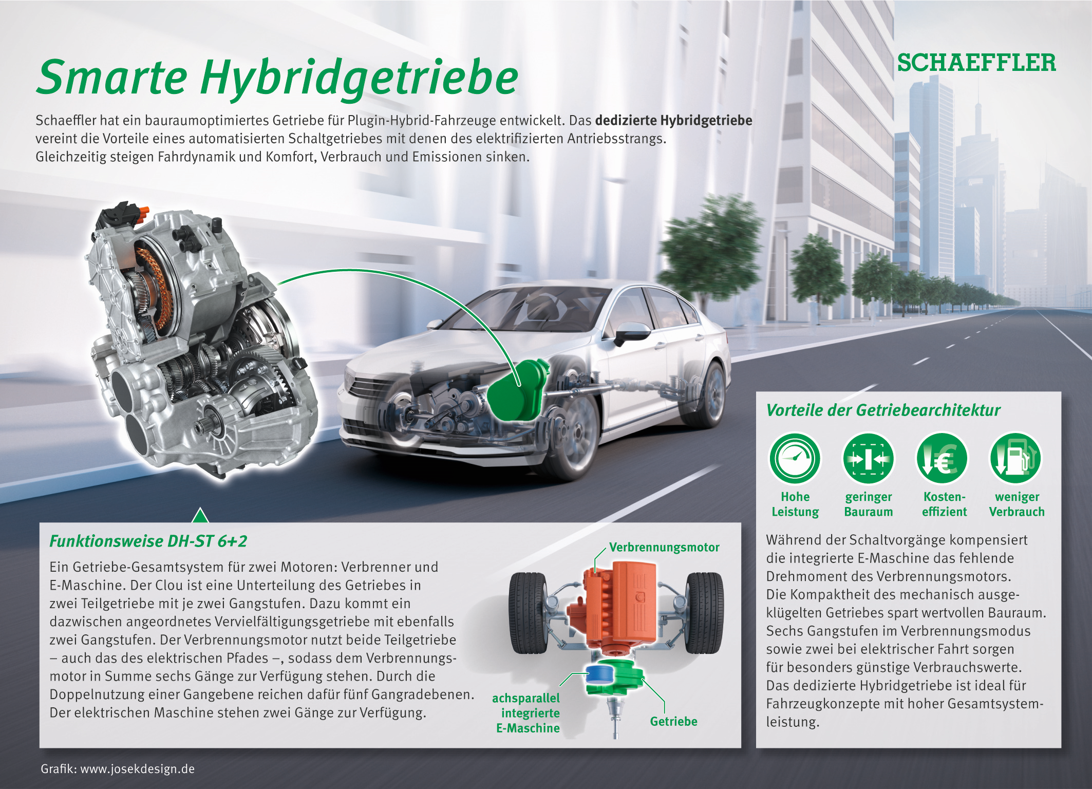 Schaeffler hat ein bauraumoptimiertes Getriebe für Plug-in-Hybrid-Fahrzeuge entwickelt. Das dedizierte Hybridgetriebe vereint die Vorteile eines automatisierten Schaltgetriebes mit denen des elektrifizierten Antriebsstrangs. Gleichzeitig steigen Fahrdynamik und Komfort, Verbrauch und Emissionen sinken / Foto/Infografik: Schaeffler
