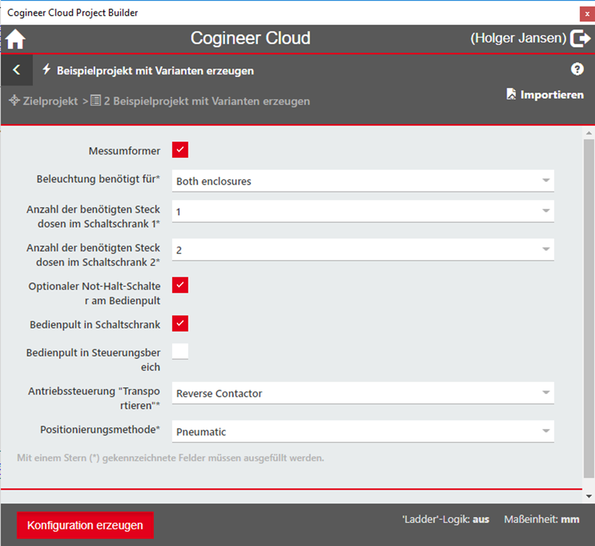 Der im Cogineer Project Builder eingeloggte Benutzer greift in der Cloud auf für ihn freigegebene Konfigurationen zu, wählt Optionen und Varianten aus und generiert dann die Schaltungsunterlagen auf Knopfdruck, Quelle Eplan Software & Service GmbH & Co. KG