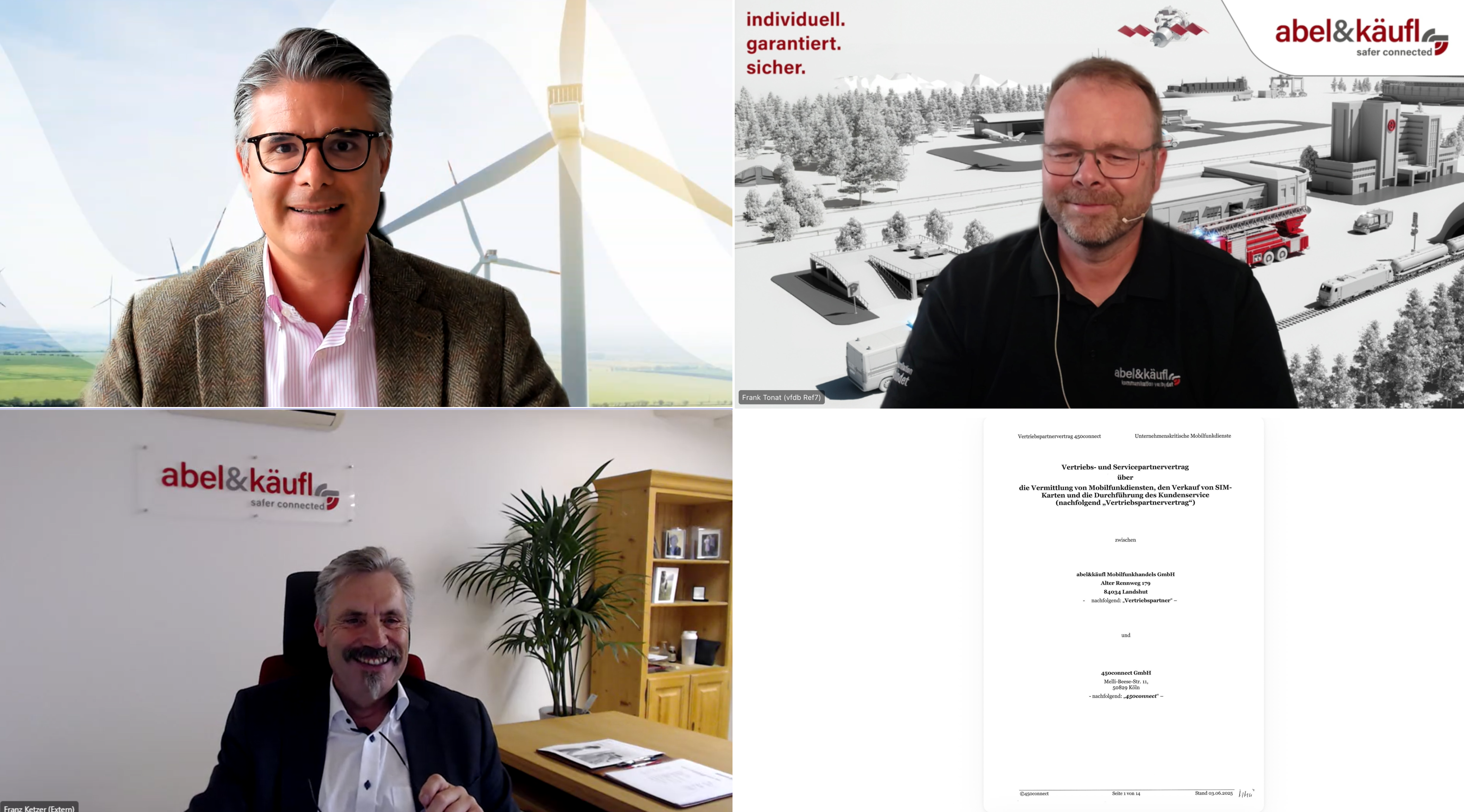 digitale Vertragsunterzeichnung am 15. Juli 2025. oben v.li.: Dr. Frederik Giessing, Geschäftsführer 450connect, Frank Tonat, Leiter Geschäftsentwicklung abel&käufl unten li.: Franz Ketzer, Geschäftsführer Vertrieb abel&käufl