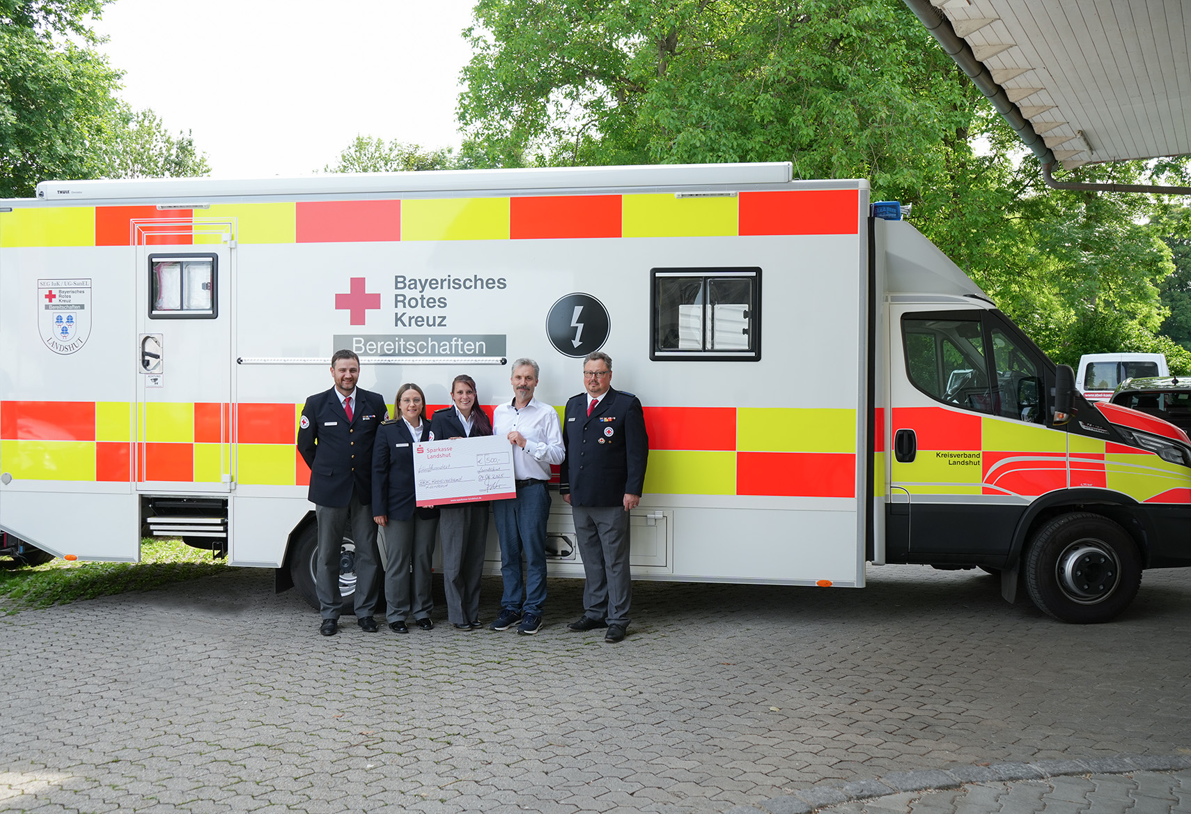 Bei der Spendenübergabe vor Ort freuten sich (v. l.): Kreisbereitschaftsleiter Florian Sommerer, 1. stv. Kreisbereitschaftsleiterin Susanne Krampfl, Kreis- und Bereitschaftsjugendwartin Julia Lobinger, Franz Ketzer sowie Alexander Bernatz, BRK-Mitglied und Mitarbeiter bei abel & käufl.