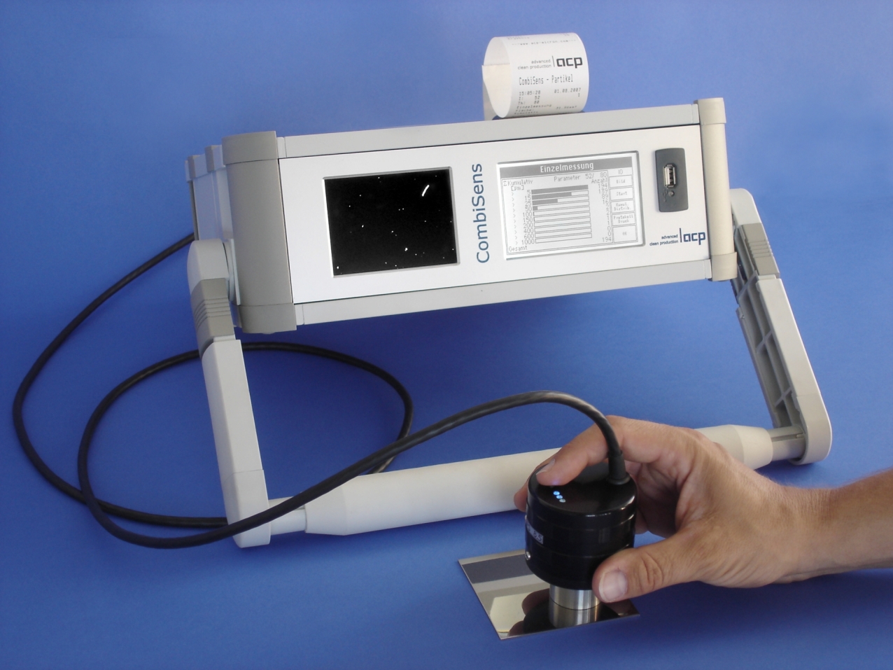 The new “CombiSens” inspection system by acp GmbH permits quick, reliable, non-destructive detection and quantification of particle pollution, for example filings and dust, and of coating films, such as oils, greases, coolants or anti-corrosion agents.