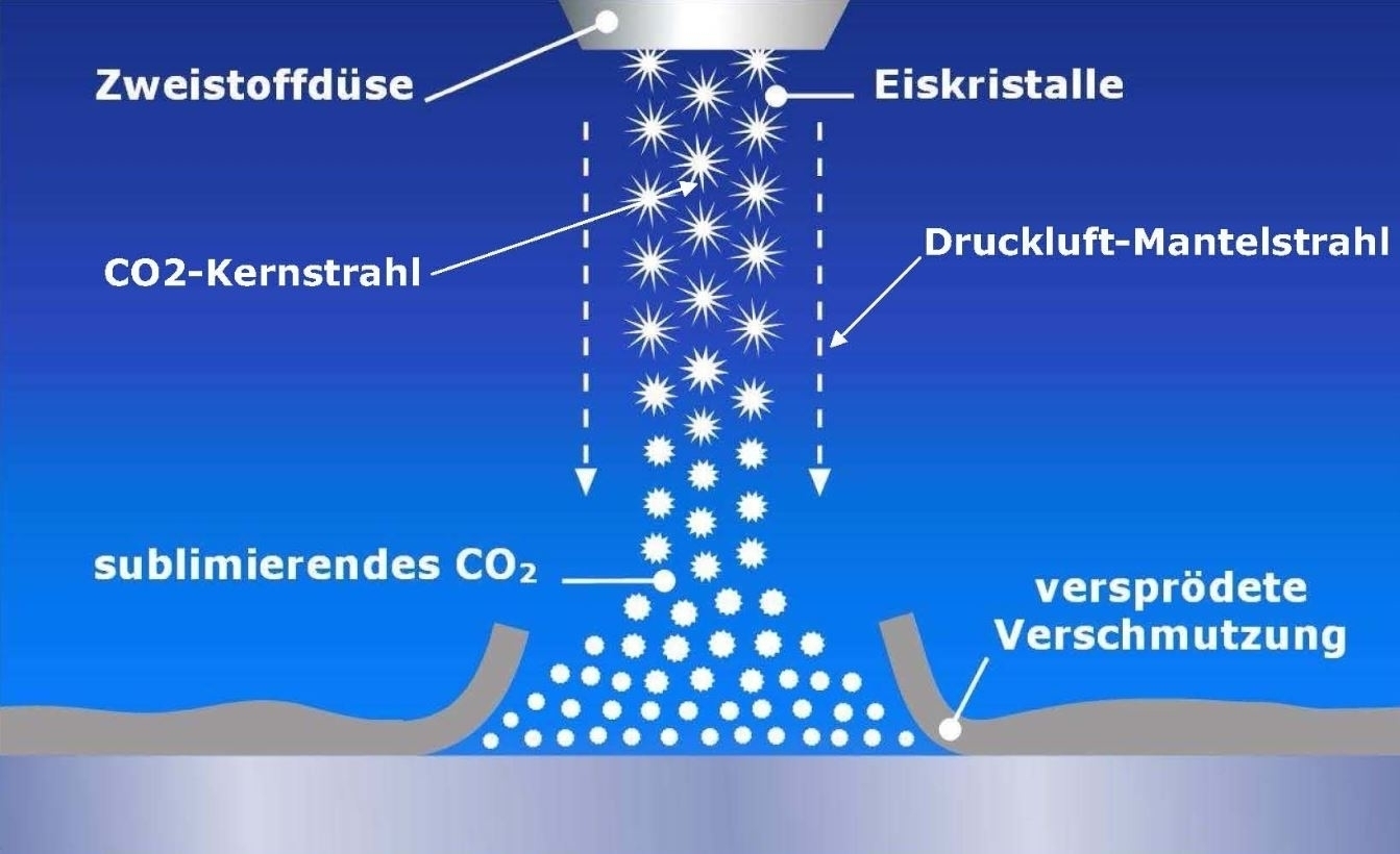Der ungiftige und nicht brennbare CO2-Schnee entfernt durch die Kombination mechanischer, chemischer sowie thermischer Eigenschaften feste und filmische Verunreinigungen trocken und rückstandsfrei.