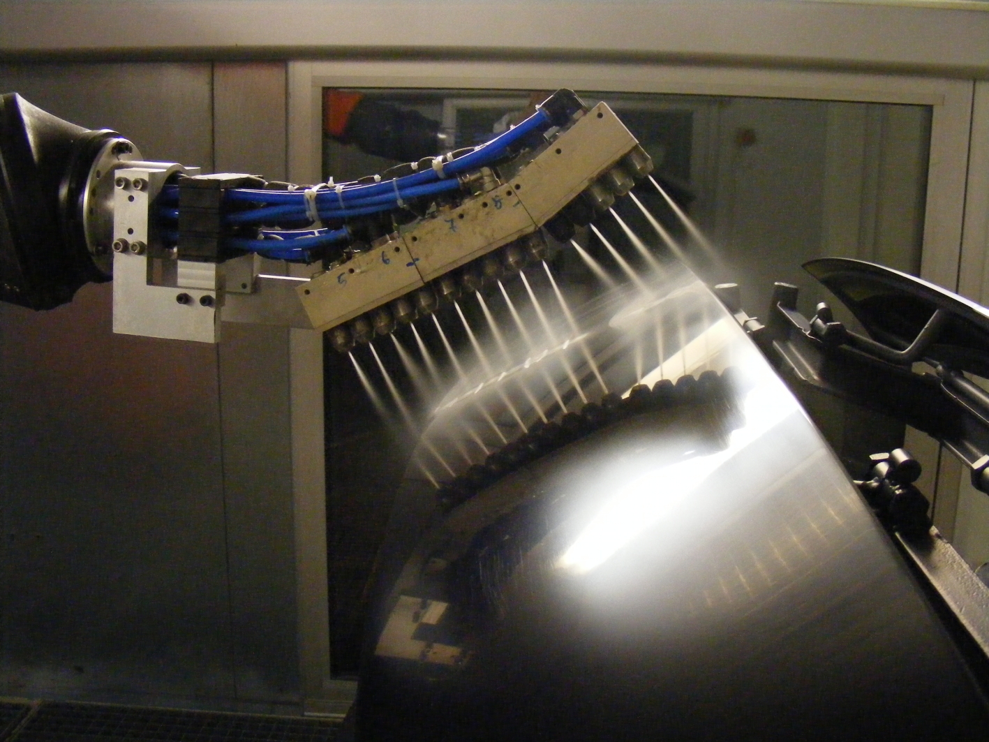 The CO2 cleaning system is fitted with three nozzle arrays which are turned on and off via the robot controls to ensure economical operation. Each array has five cleaning heads designed with supersonic two-component ring nozzles