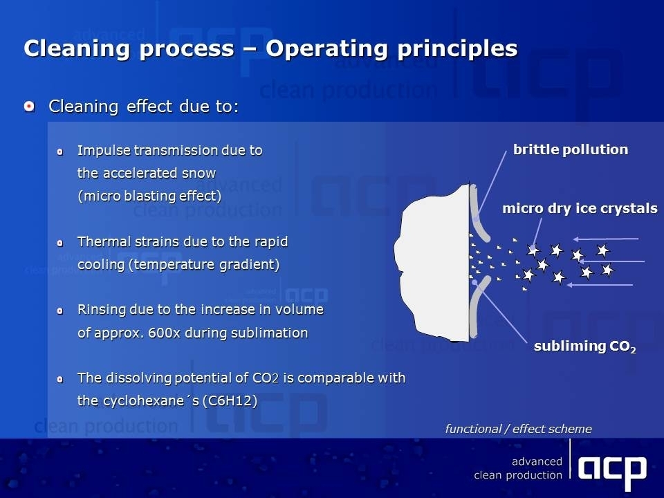 The environmentally-harmless CO2 snow-jet technology has technical, economical and ecological advantages. The cleaning process is dry and residue-free.