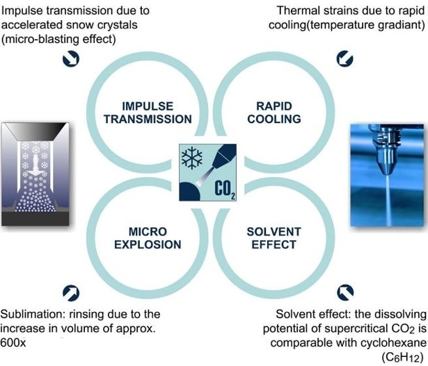 The cleaning medium used by the technology is liquid carbon dioxide, which is generated as a by-product from chemical processes and energy generation from biogas and therefore environmentally neutral. It is guided through a wear-free two-component ring nozzle and expands on exiting to form fine CO2 snow. This core jet is then bundled by a separate jacketed jet of compressed air and accelerated to supersonic speed. When the easily-focused jet of snow and compressed air impacts on the surface to be cleaned, a combination of thermal, mechanical, sublimation and solvent effects occur. The interaction of these four mechanisms of action detaches particulate (e.g. dust, chips, abrasion, micro burrs) and filmic contamination (e.g. separating agents, drawing oils, emulsions, silicones, traces of powder) in a reproducible manner. The aerodynamic force of the compressed air carries away the detached contamination, which is then removed by an integrated extraction system.