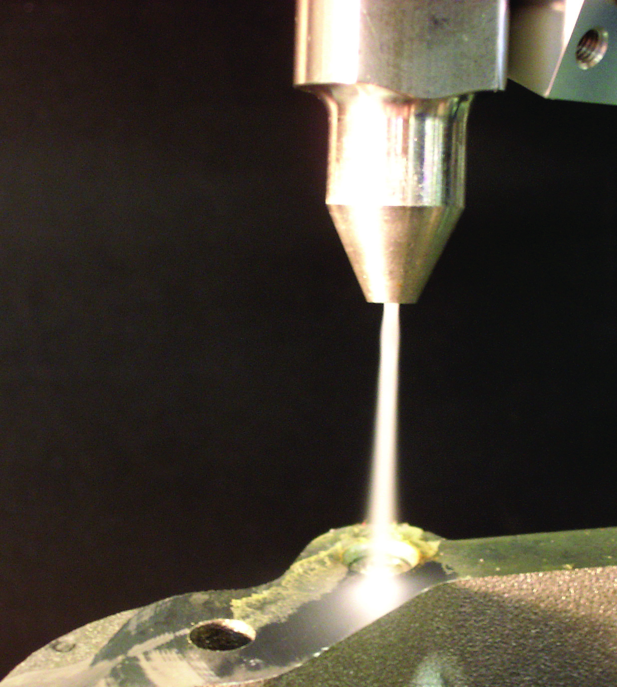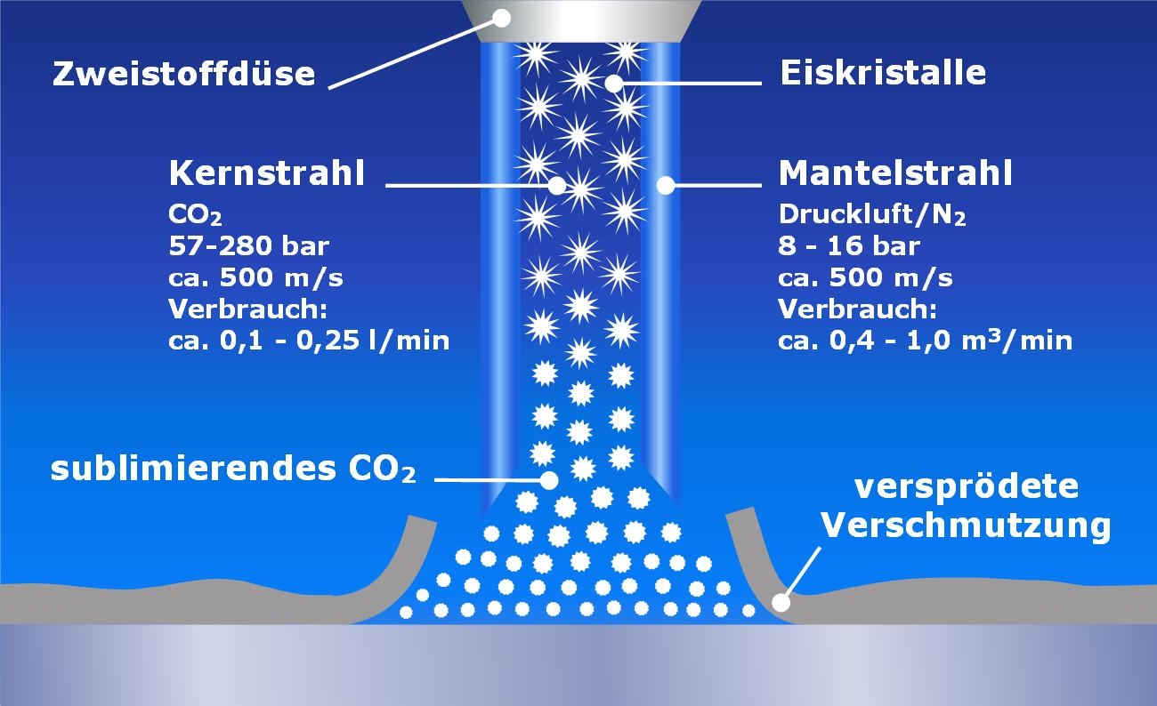 Hoher Strahlimpuls für überzeugende Reinigungsleistung Kernstück der nicht abrasiven CO2-Schneestrahltechnologie des Esslinger Unternehmens ist der als Überschall-Zweistoffringdüse ausgeführte Reinigungskopf. Das flüssige Kohlendioxid entspannt beim Austreten aus der Düse zu einem Schnee/Gas-Gemisch, das den Kernstrahl bildet. Zusätzlich wird Druckluft als Mantelstrahl zugeführt, der die CO2-Schneekristalle auf Überschallgeschwindigkeit beschleunigt. Daraus resultiert das sehr gute Reinigungsvermögen der Schneekristalle. Die Beschleunigung mit Druckluft bewirkt die gegenüber Einstoff-Düsensystemen wesentlich höhere Reinigungsleistung bei deutlich geringerem CO2-Verbrauch.