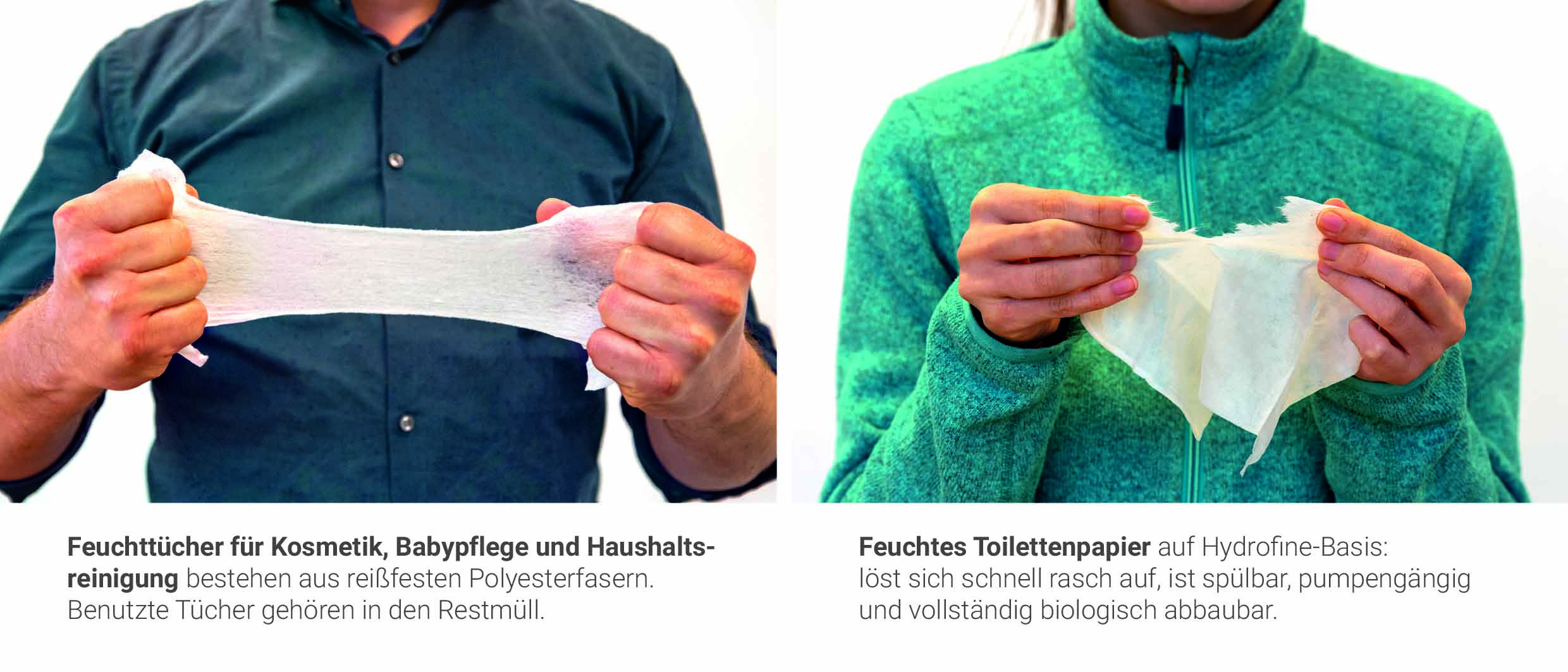 Links: Feuchttücher für Kosmetik, Babypflege und Haushaltsreinigung bestehen aus reißfesten Polyesterfasern. Benutzte Tücher gehören in den Restmüll. Rechts: Feuchtes Toilettenpapier auf Hydrofine-Basis: löst sich schnell auf, ist spülbar, pumpengängig und vollständig biologisch abbaubar.