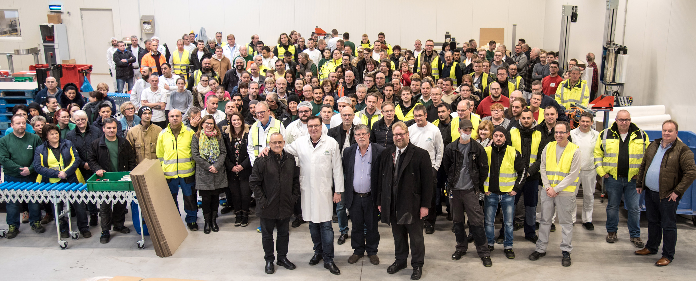 Erfolgsgarant: Die Belegschaft der Albaad Deutschland GmbH; vorne: Dan Mesika, CEO des israelischen Mutterkonzerns, Geschäftsführer Wolfgang Tenbusch und Bürgermeister Kai Hutzenlaub. Foto: Carsten Hinnah