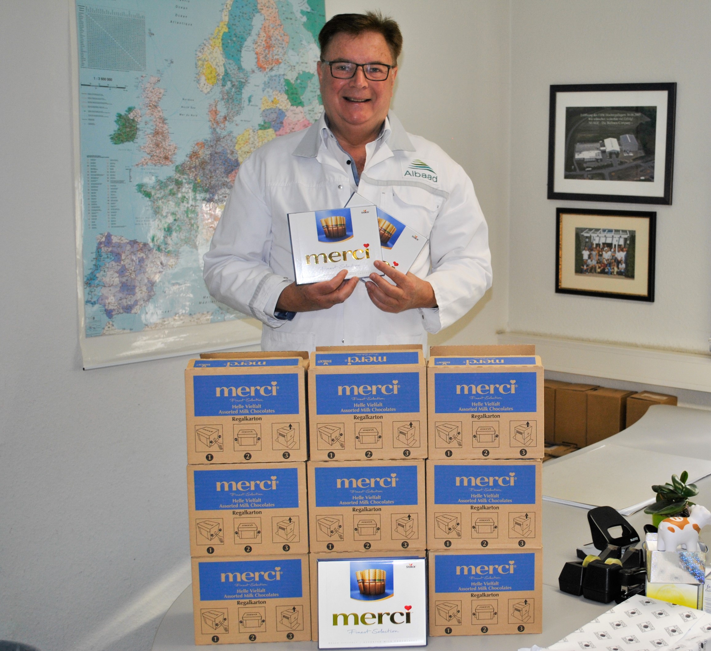 600 Tafeln Merci-Schokolade verteilte Albaad Deutschland Geschäftsführer Wolfgang Tenbusch zu Ostern. Mit den Löhnen und Gehältern für Mai wurde die steuerfreie Zulage an die Mitarbeiter ausgezahlt.