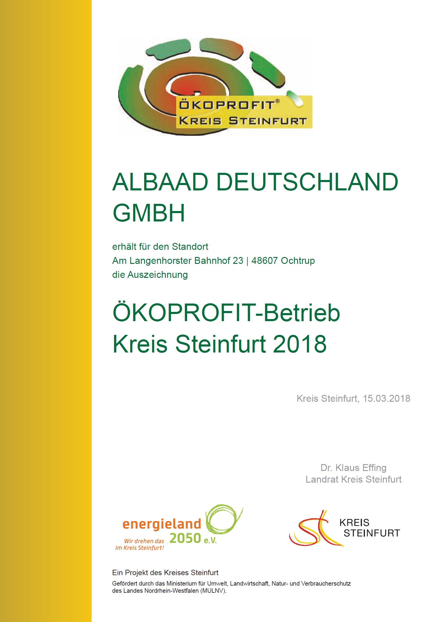 Schon lange bemüht sich Albaad darum, seine Öko-Effizienz zu steigern. Bereits im Jahr 2018 wurde das Unternehmen vom Kreis Steinfurt als Ökoprofit-Betrieb ausgezeichnet.