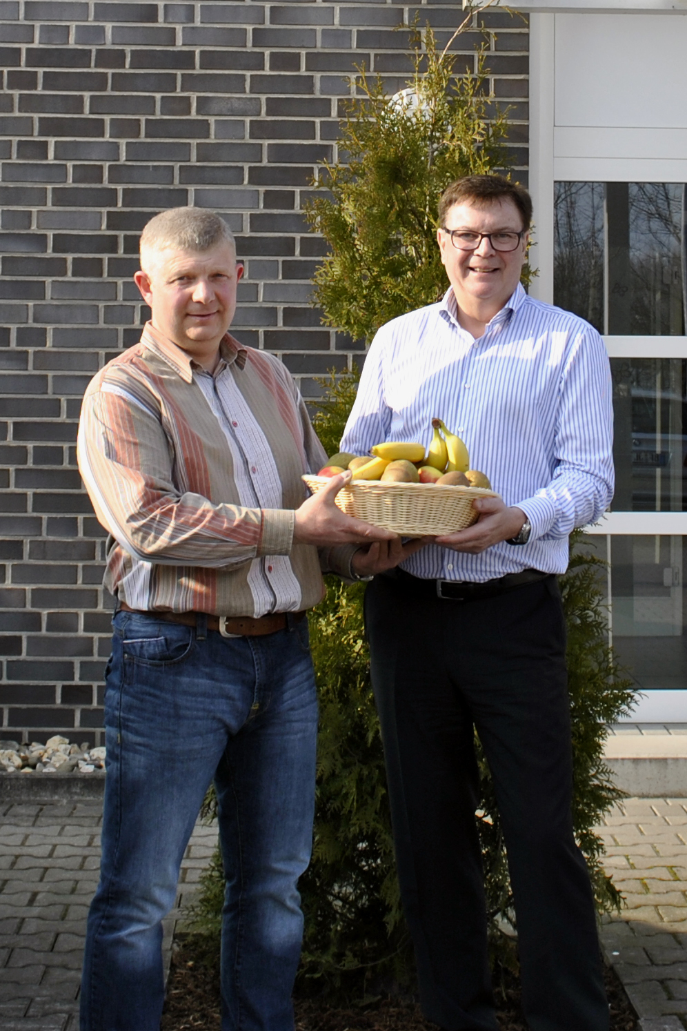 5,4 Kilo nahm Andreas Nickel (l.) ab, damit das so bleibt, überreichte Albaad-Geschäftsführer Wolfgang Tenbusch dem Maschinenführer einen Obstkorb (Foto: Albaad Deutschland GmbH)