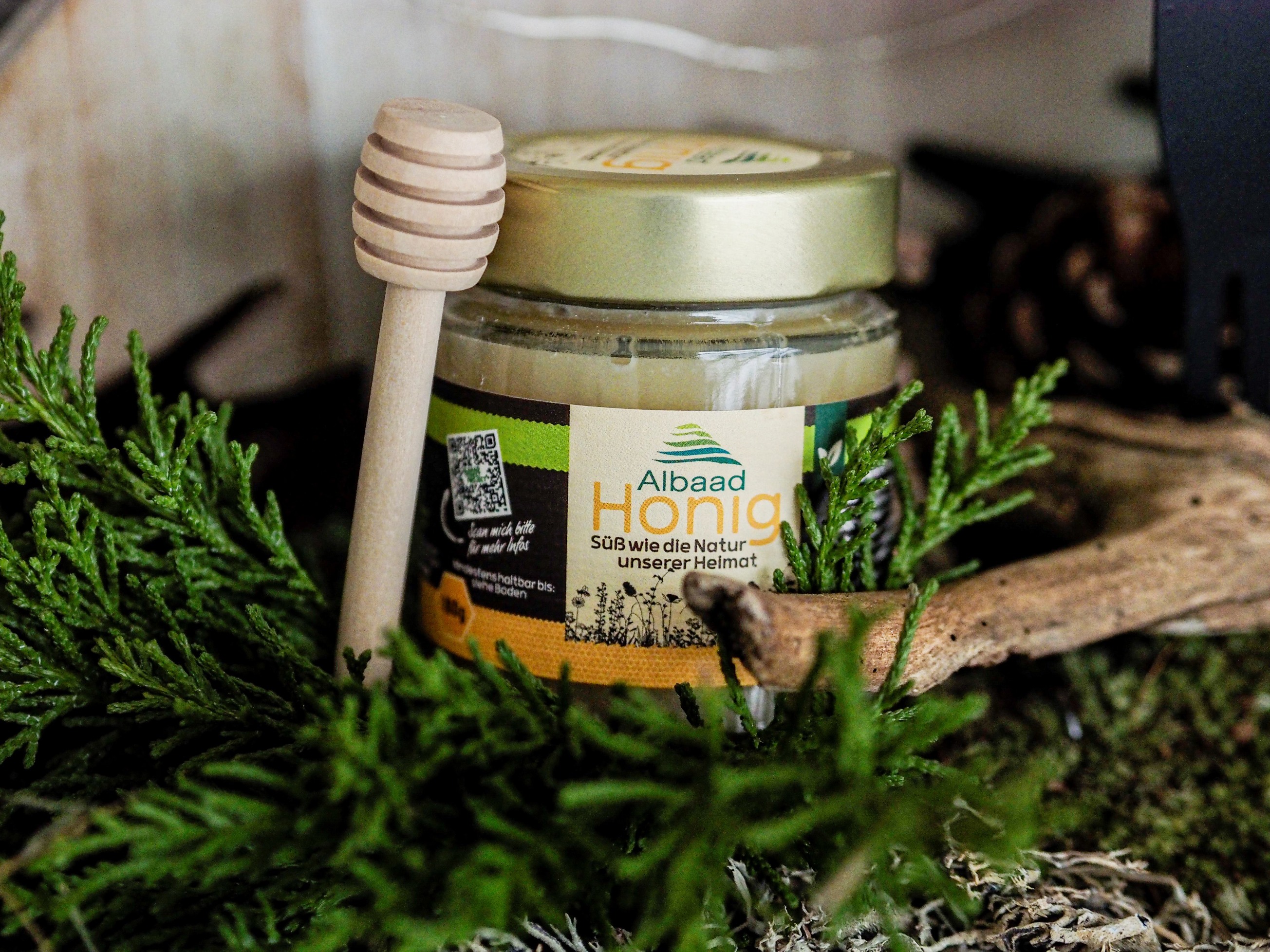 Ein Glas des ersten „Albaad-Honigs“, abgefüllt von den Auszubildenden des Unternehmens. Die diesjährige Ernte wird am 5. und 7. Dezember auf dem Ochtruper Weihnachtsmarkt verkauft. Der gesamte Erlös fließt zurück in das Albaad Forest Project und unterstützt weitere Naturschutzmaßnahmen.