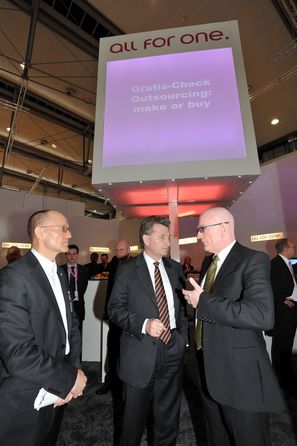 (von links nach rechts) Klaus Haasis, Geschäftsführer MFG Medien- und Filmgesellschaft Baden-Württemberg mbH, Günther Oettinger, Ministerpräsident Baden-Württemberg, Lars Landwehrkamp, Vorstandssprecher All for One Midmarket AG