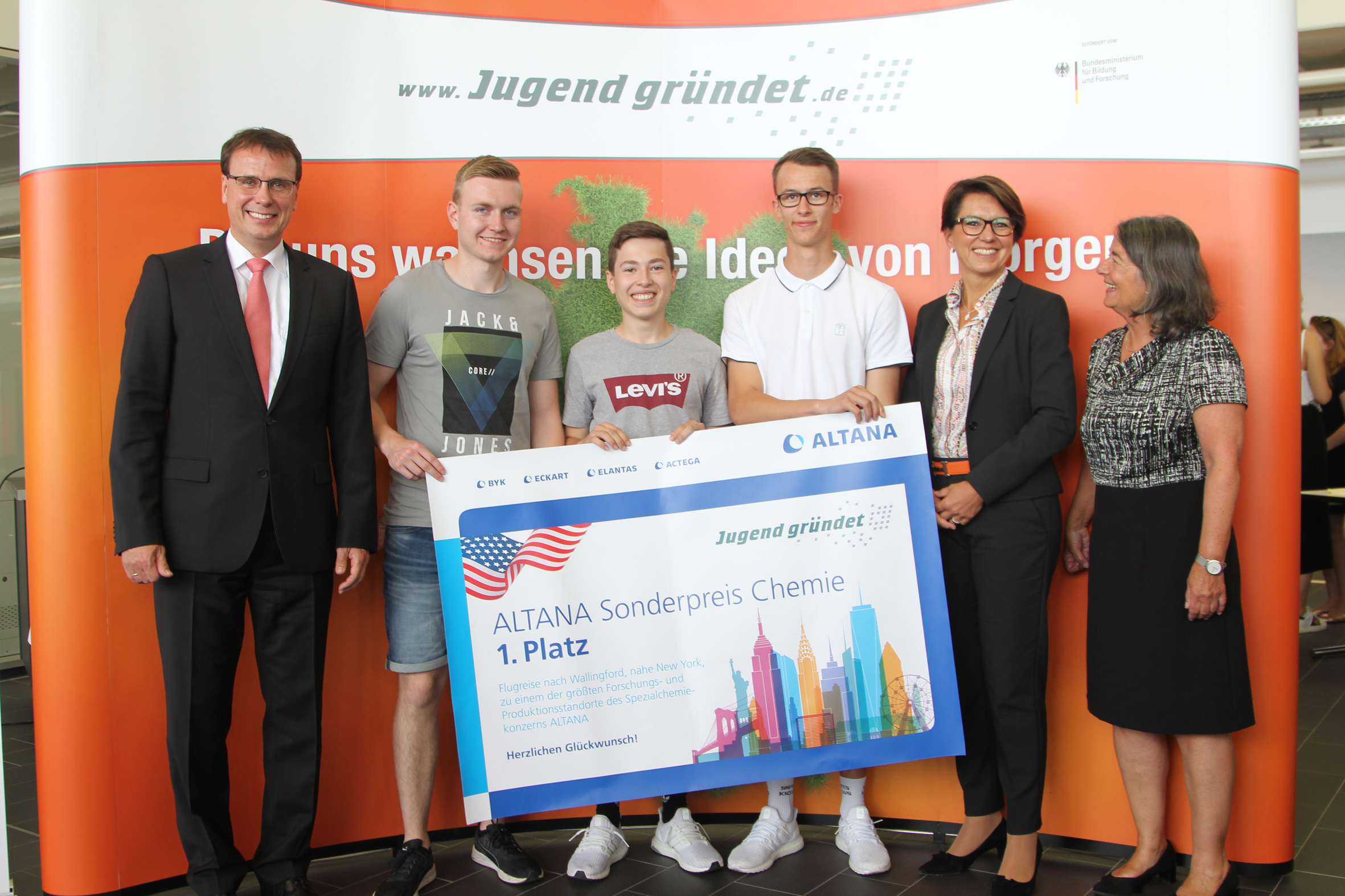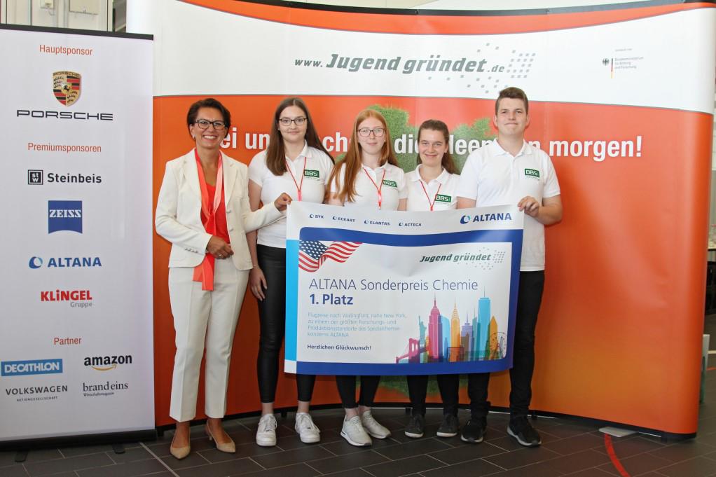 Die Gewinner des ALTANA Sonderpreises Chemie mit Dr. Anette Brüne (ALTANA) (Foto: © "Jugend gründet")