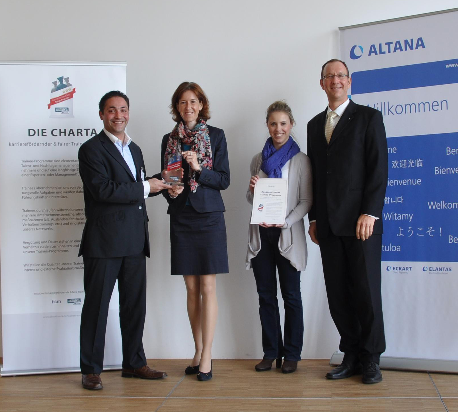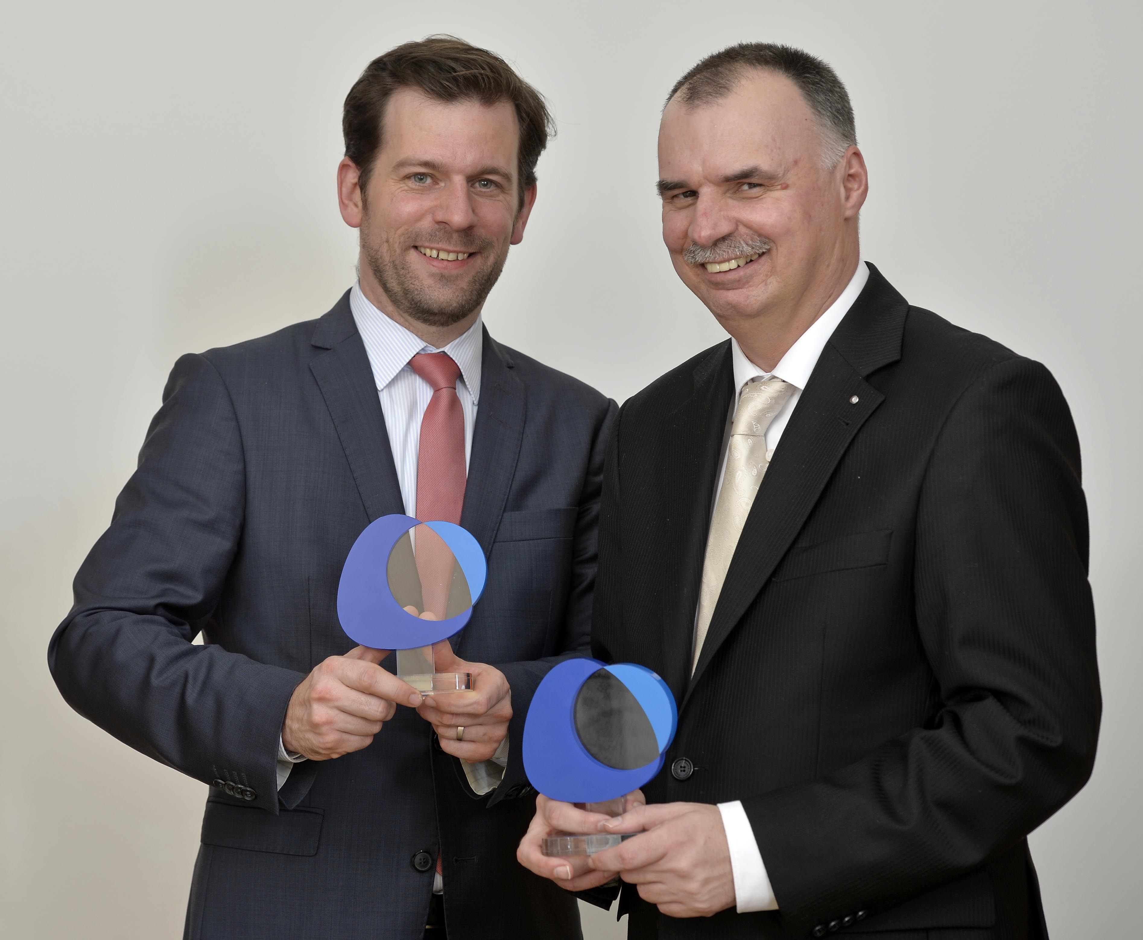 The ALTANA Innovation Award 2013 goes to the winner team of ACTEGA Terra: Timo Kondziela (left) and Frank Kamphuis (right) received the award in Wesel, also on behalf of Tim Kammer and Marcel Altenburg