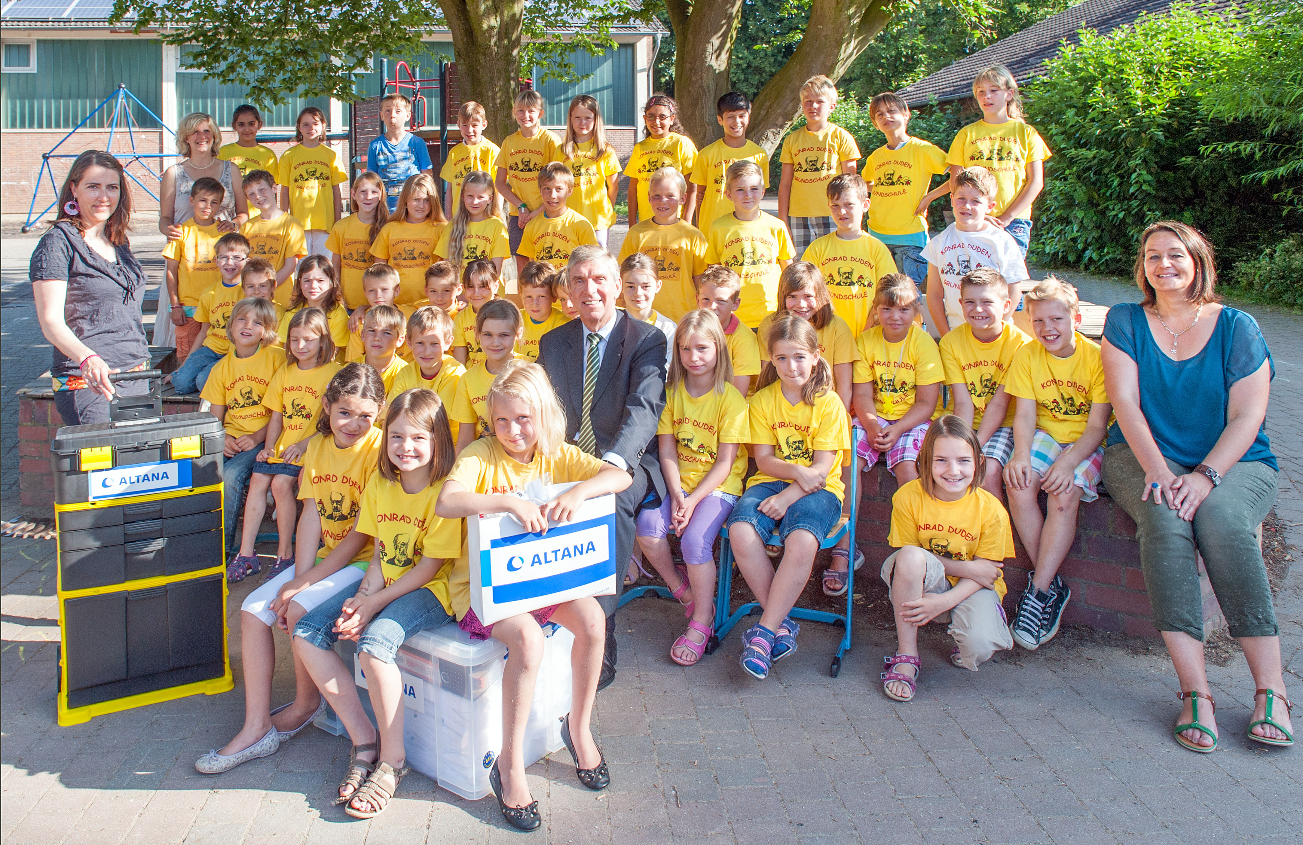 Vorstandsvorsitzender von ALTANA AG, Dr. Matthias L. Wolfgruber (Mitte) übergibt stellvertretend für alle Gewinner-Schulen ein Experimentier-Set an die Schüler der Konrad-Duden-Grundschule in Wesel