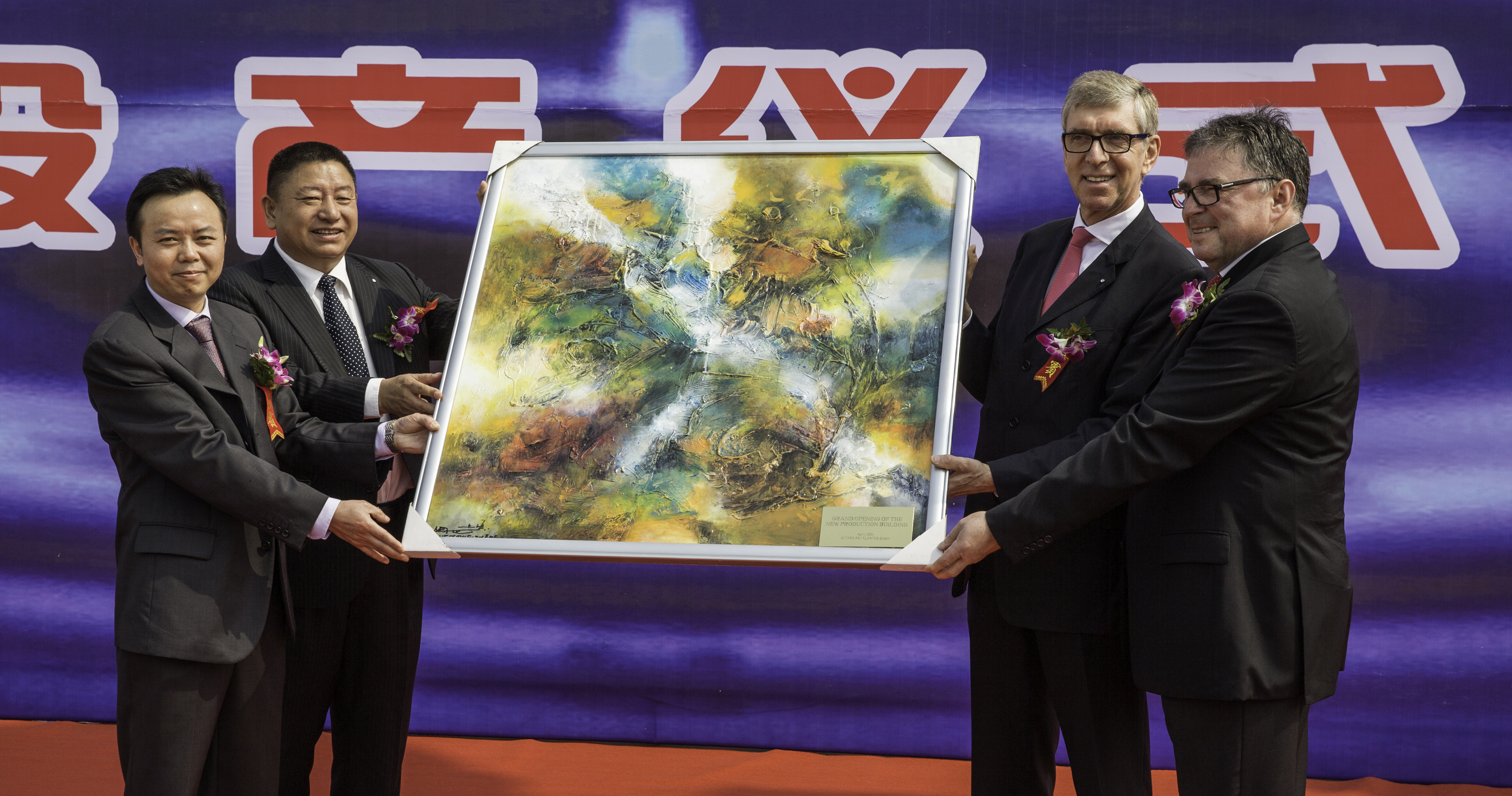 Zur Eröffnung des neuen ELANTAS Werks in Tongling ein Kunstwerk: ALTANA Vorstandschef Dr. Matthias L. Wolfgruber (2. von rechts) und ELANTAS Geschäftsbereichsleiter Dr. Guido Forstbach (rechts) übergeben ein Gemälde an ELANTAS Tongling Geschäftsführer Ye Lixin (links) und President ELANTAS Greater China Liu Linbao (2. von links)