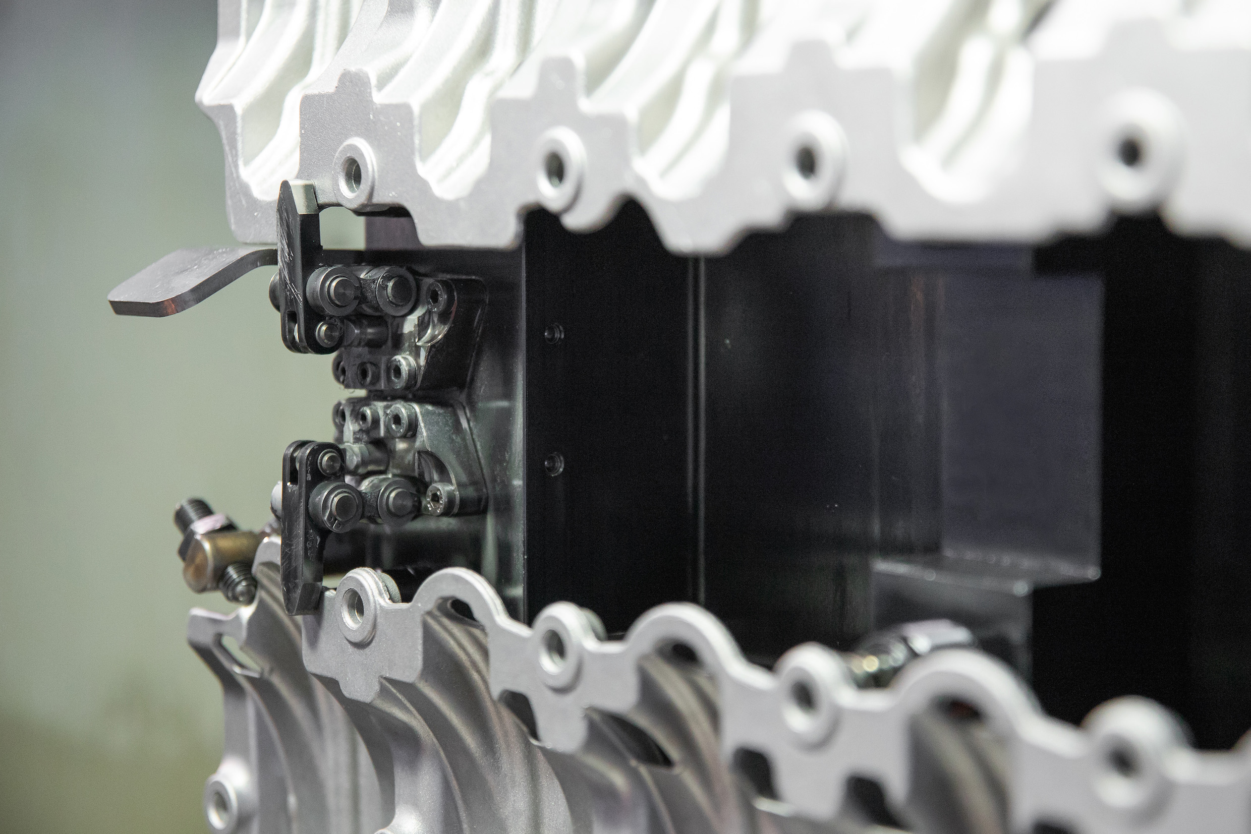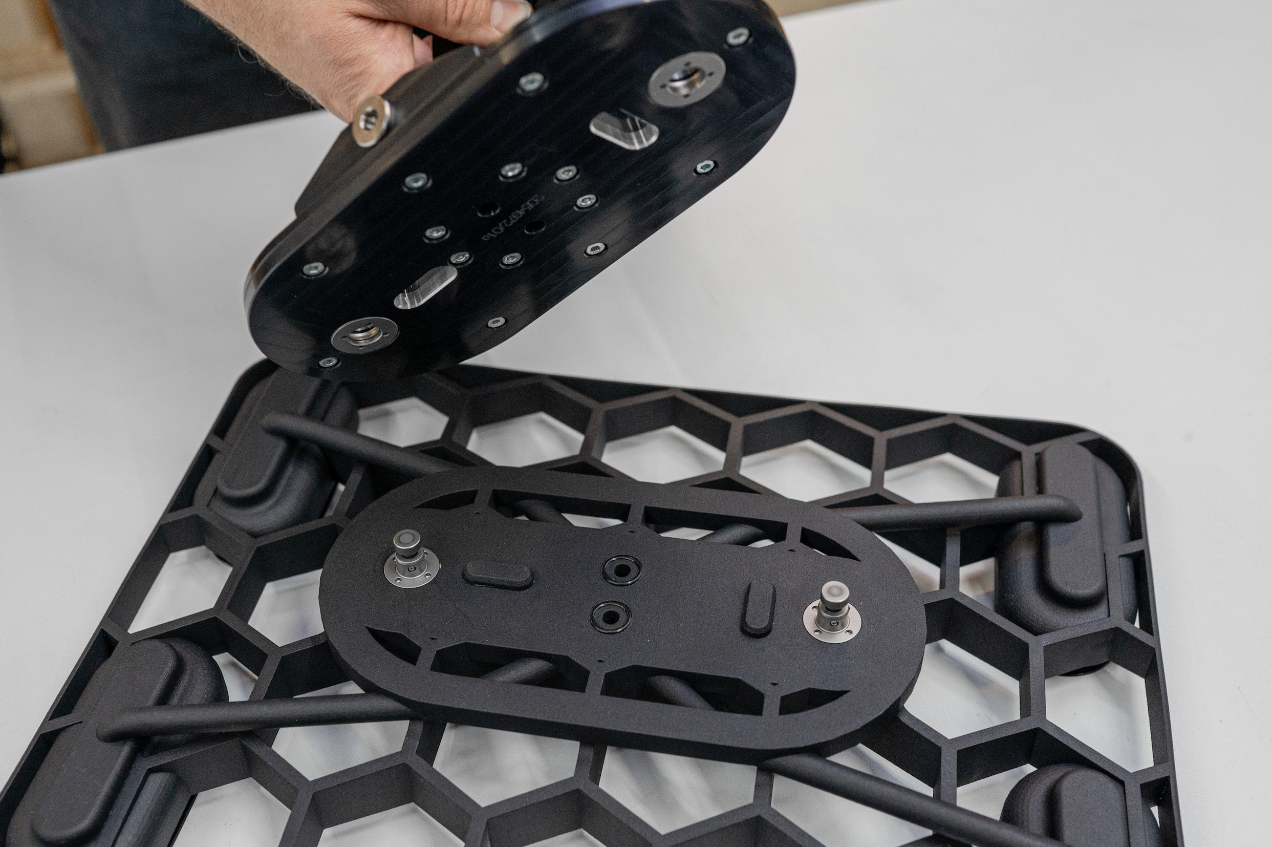 Farblich gekennzeichnet sind AMF Module verbaut, die die dazu passenden AMF Fangnippelschrauben sicher aufnehmen, die sich am unteren Ende der von ZF eigens gefertigten Aufnahmefüße befinden.