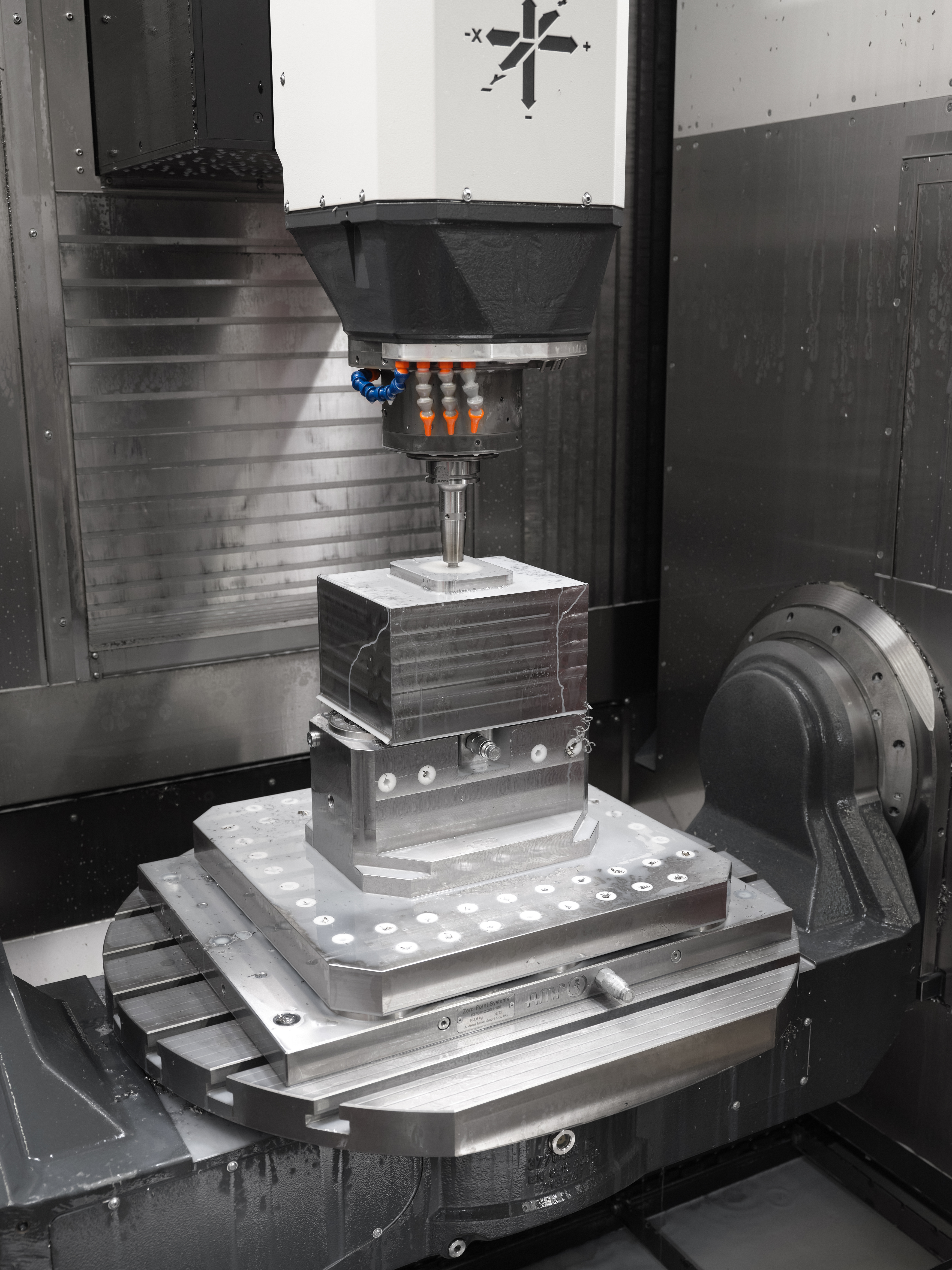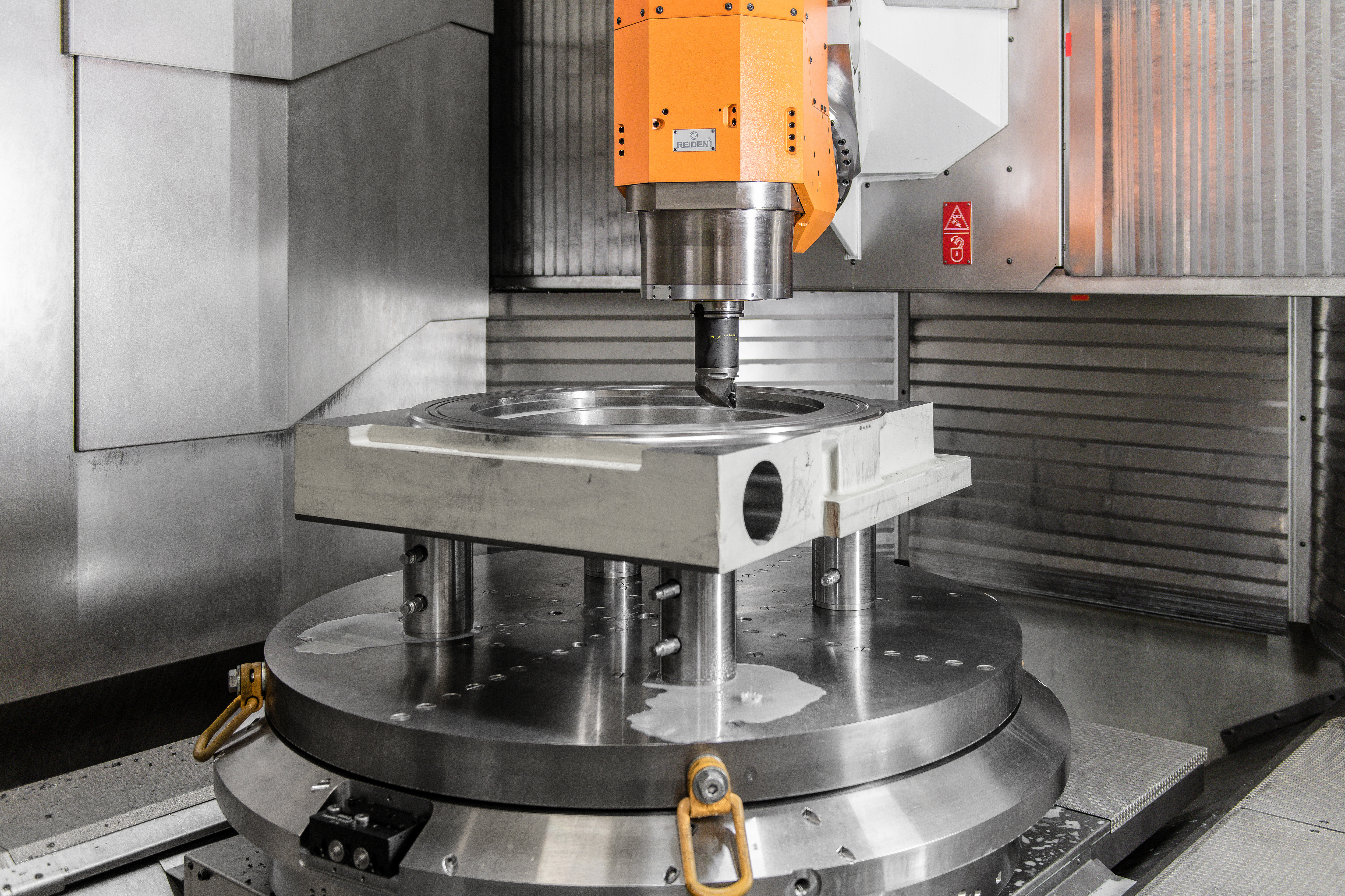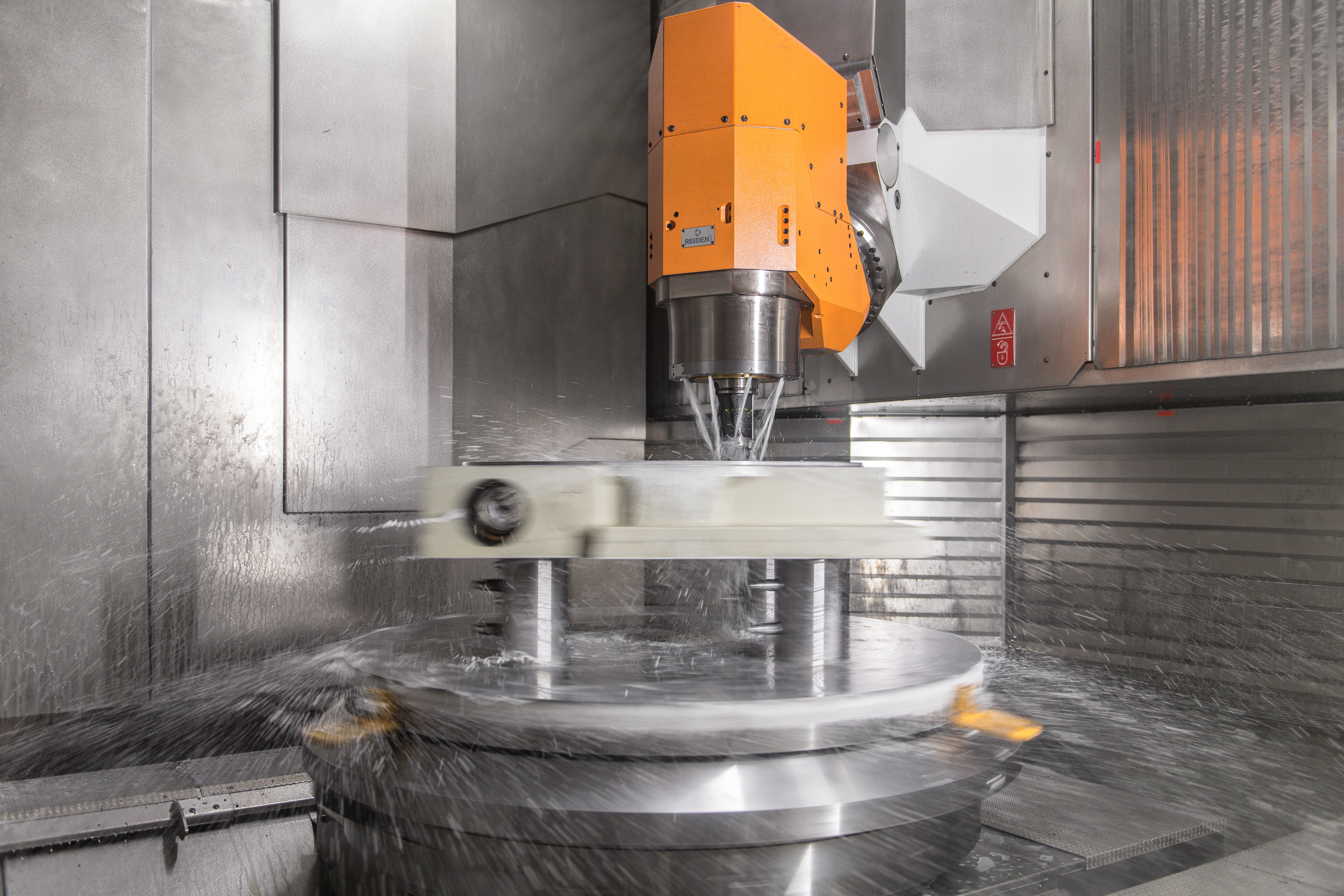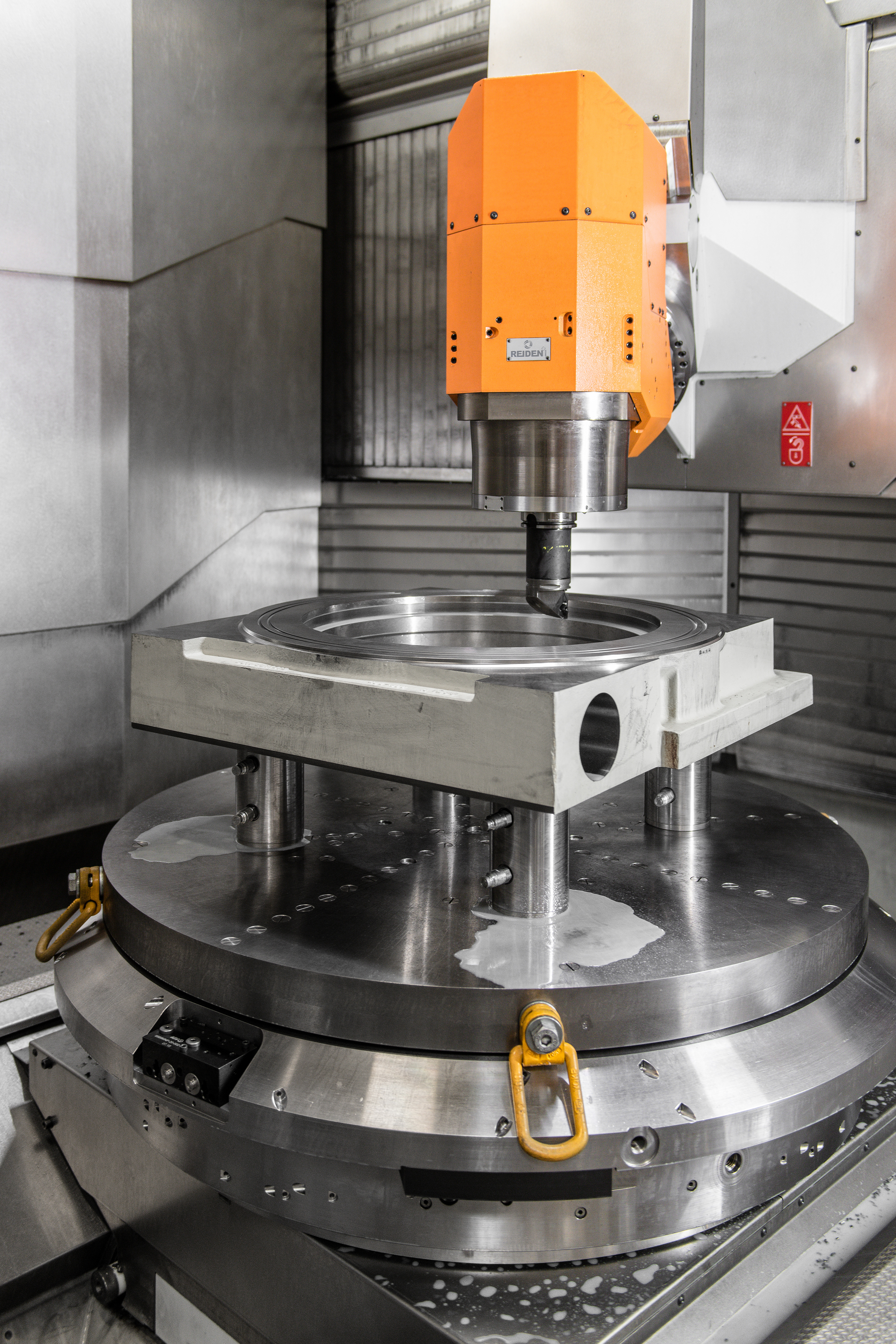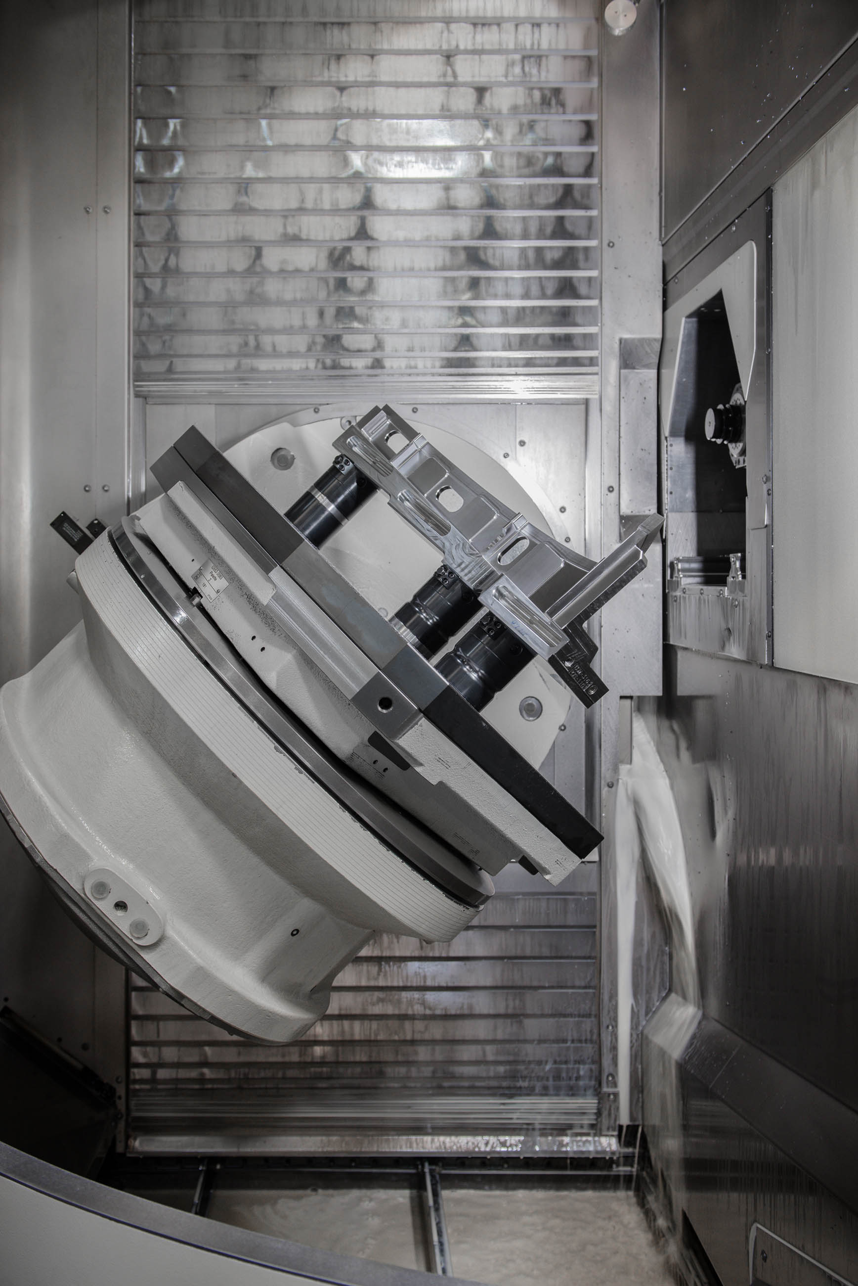 Die Grob 350 kann mit ihrem einzigartigen Maschinenkonzept der horizontalen Spindellage und dem Schwenktisch das Werkstück nach Messung der Lage für jede notwendige Bearbeitung toleranzgenau positionieren.