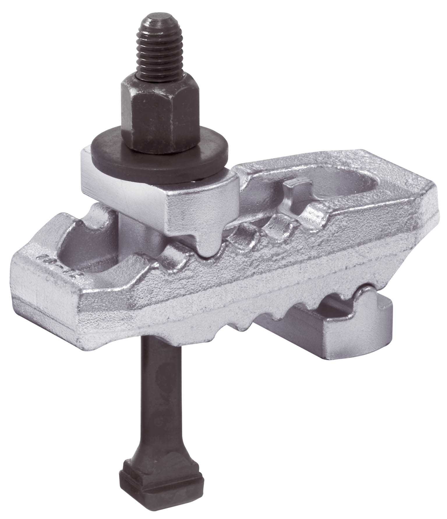 Das geschmiedete Spannelement Krokodil von AMF verfügt über ein Druckstück und einen Gegenhalter, die beide verstellbar und unverlierbar mit dem Spanneisen verbunden sind.