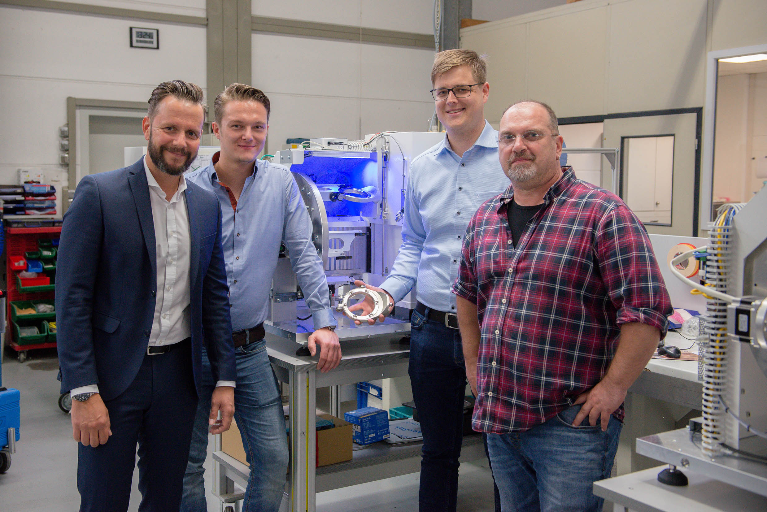 Das Team vor dem Automations-Team. (V.li.) Fertigungsleiter Sebastian Hellwig, Zerspanungsmechanikerin Ibah Koda (beide Güthle), Verkaufsleiter Erik Laubengeiger und Produktmanager Maximilian Gress (AMF) vor Smart Automation, Smart Door und Smart Cleaning.