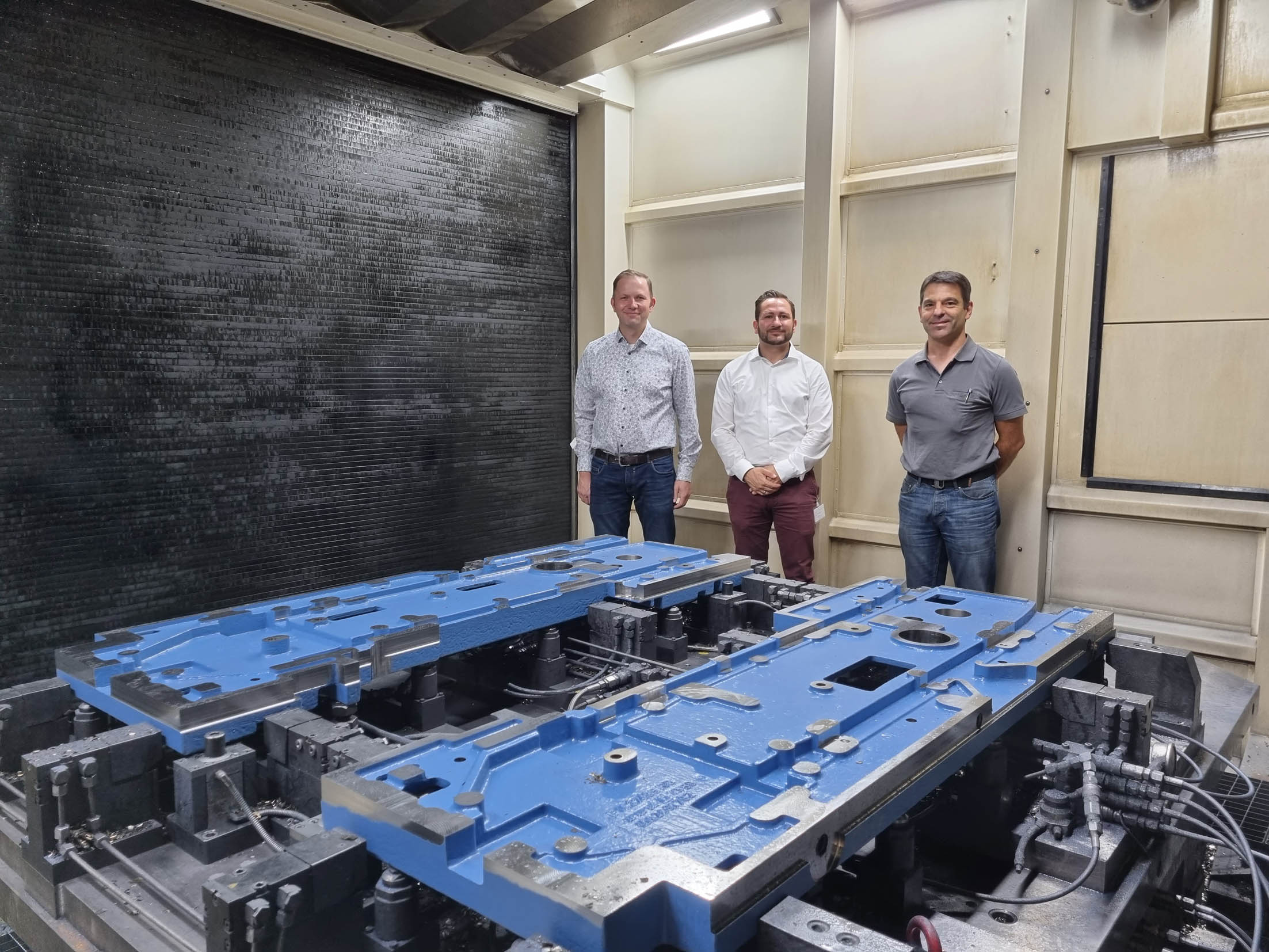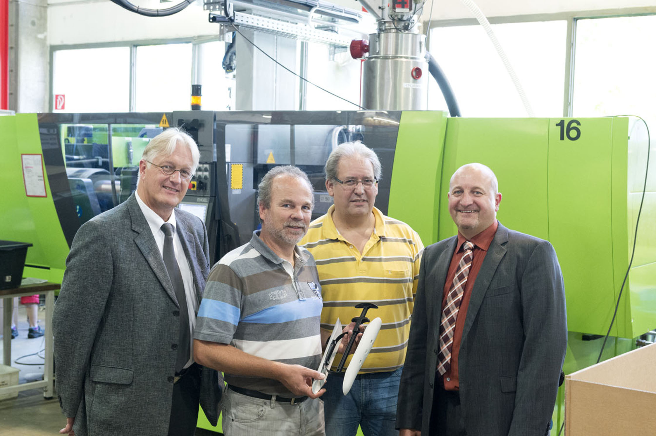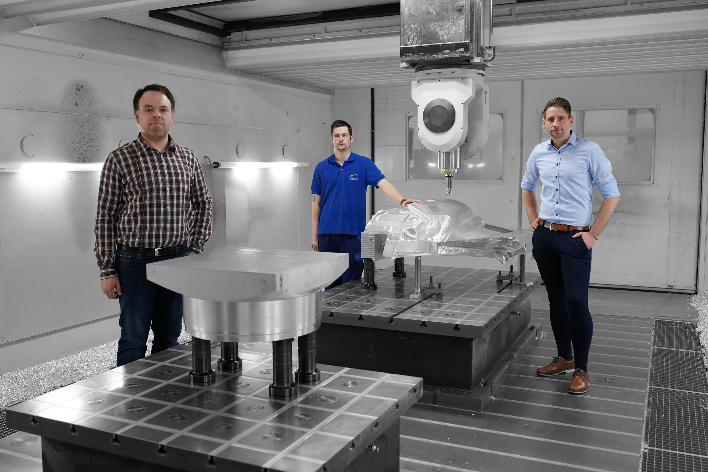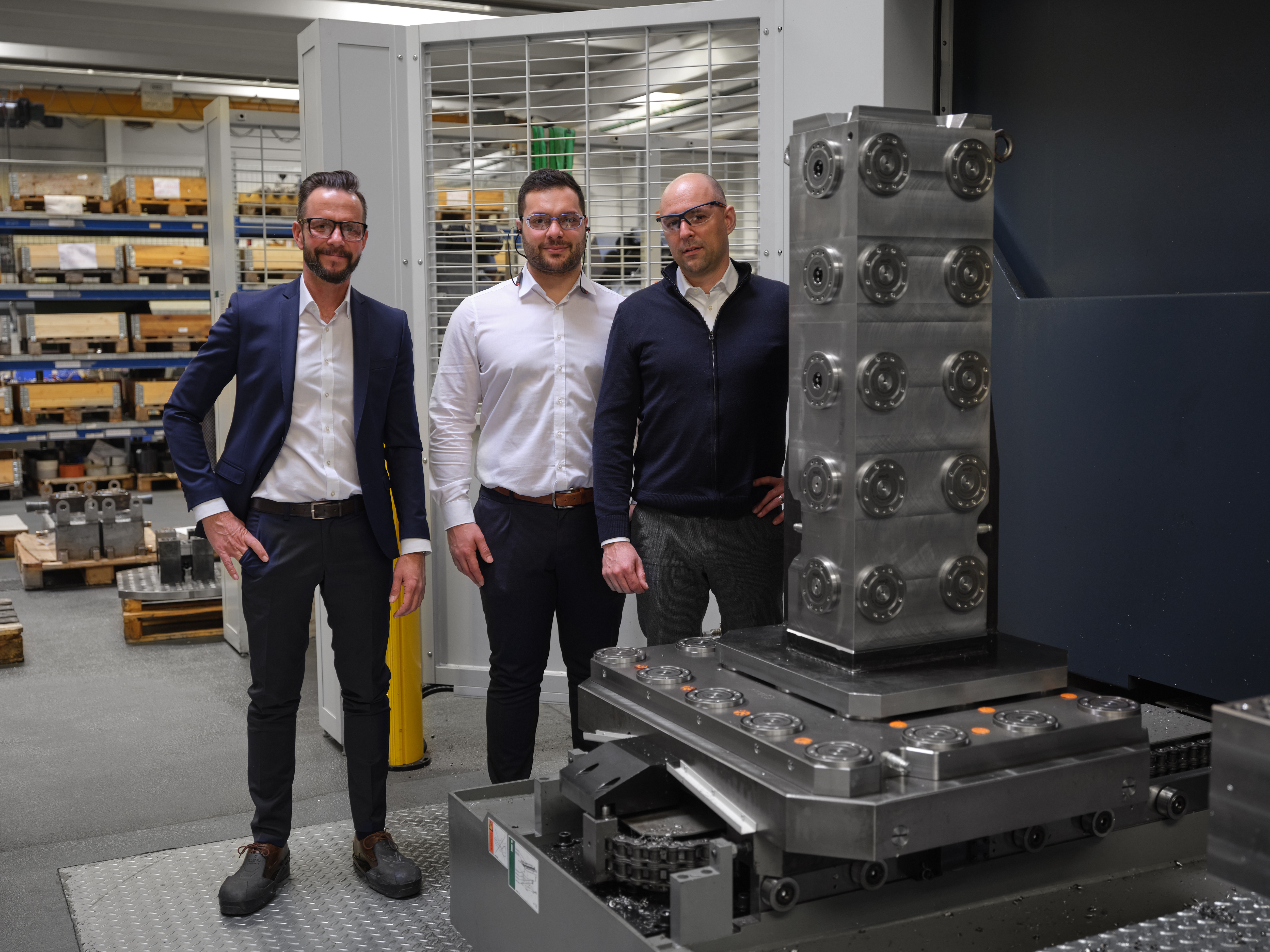 Bei Kocher-Plastik wurden die Mitarbeiter in der Fertigung frühzeitig in die Anschaffung des AMF Nullpunktspannsystems einbezogen. (v. links) Andreas Dietzsch k-p, Markus Branz AMF, Rudi Wolber k-p.