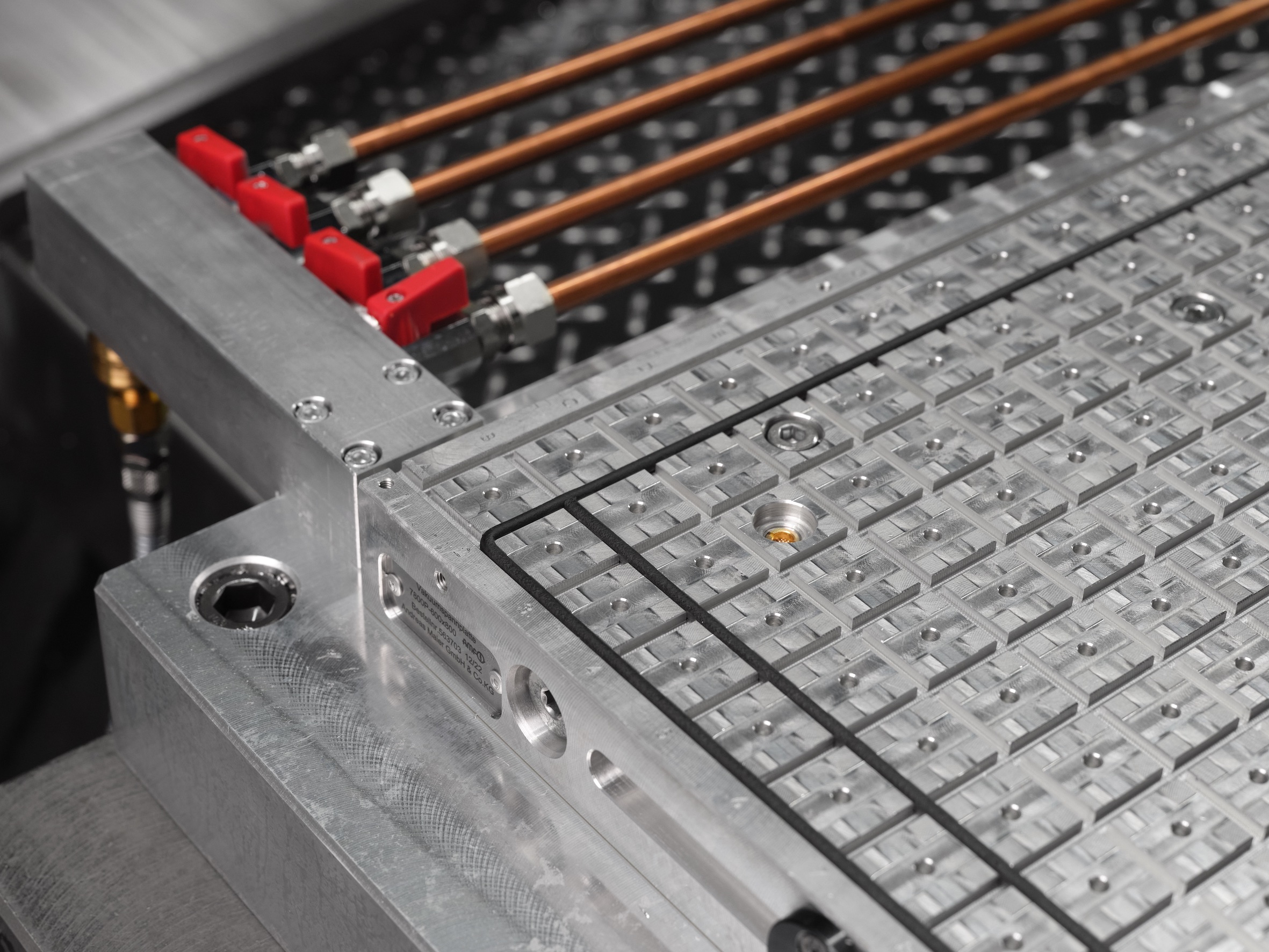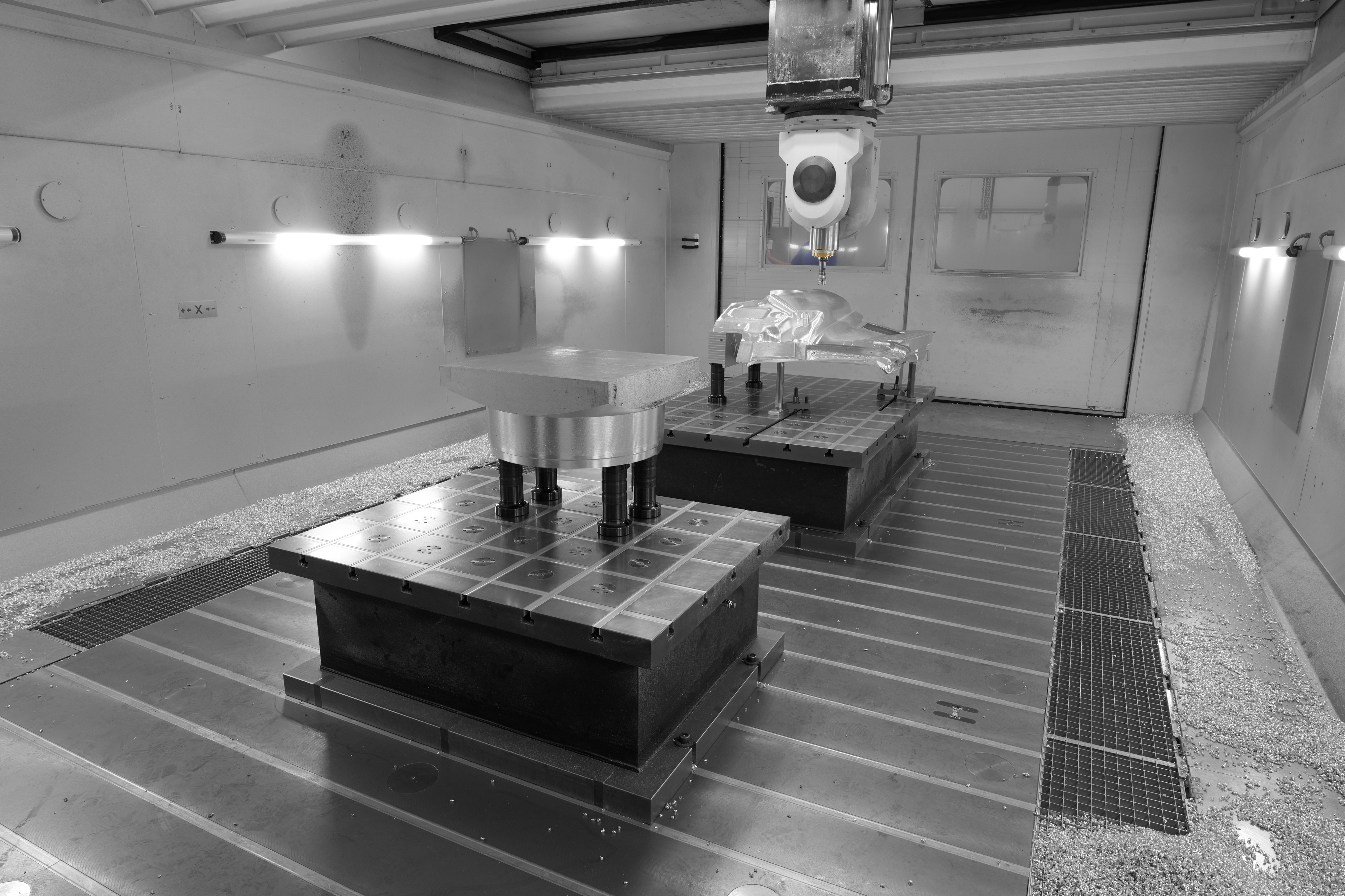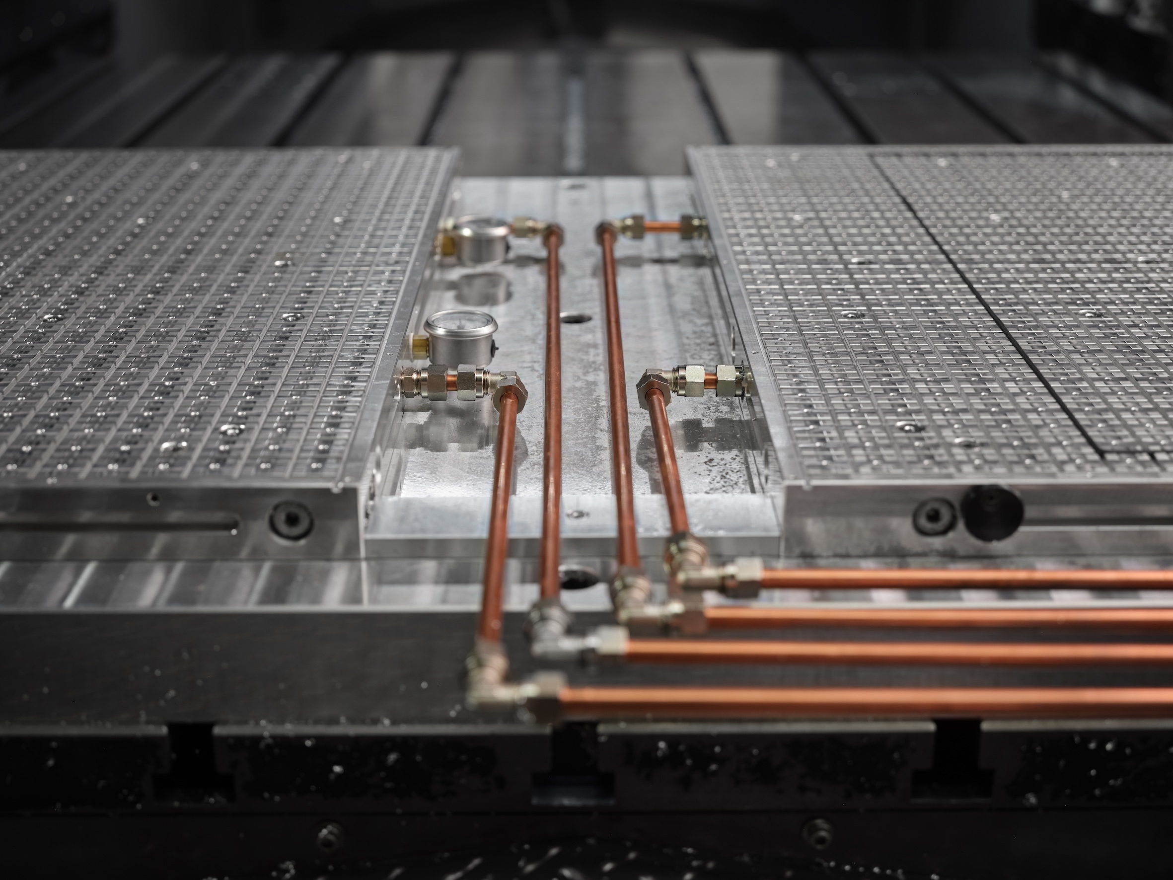 Seit Frühjahr 2023 sind zwei AMF-Vakuumspannplatten Premium Line der Fellbacher Spannexperten in den Abmessungen 600 × 800 mm mit einer Grundplatte verbunden auf dem Maschinentisch befestigt.