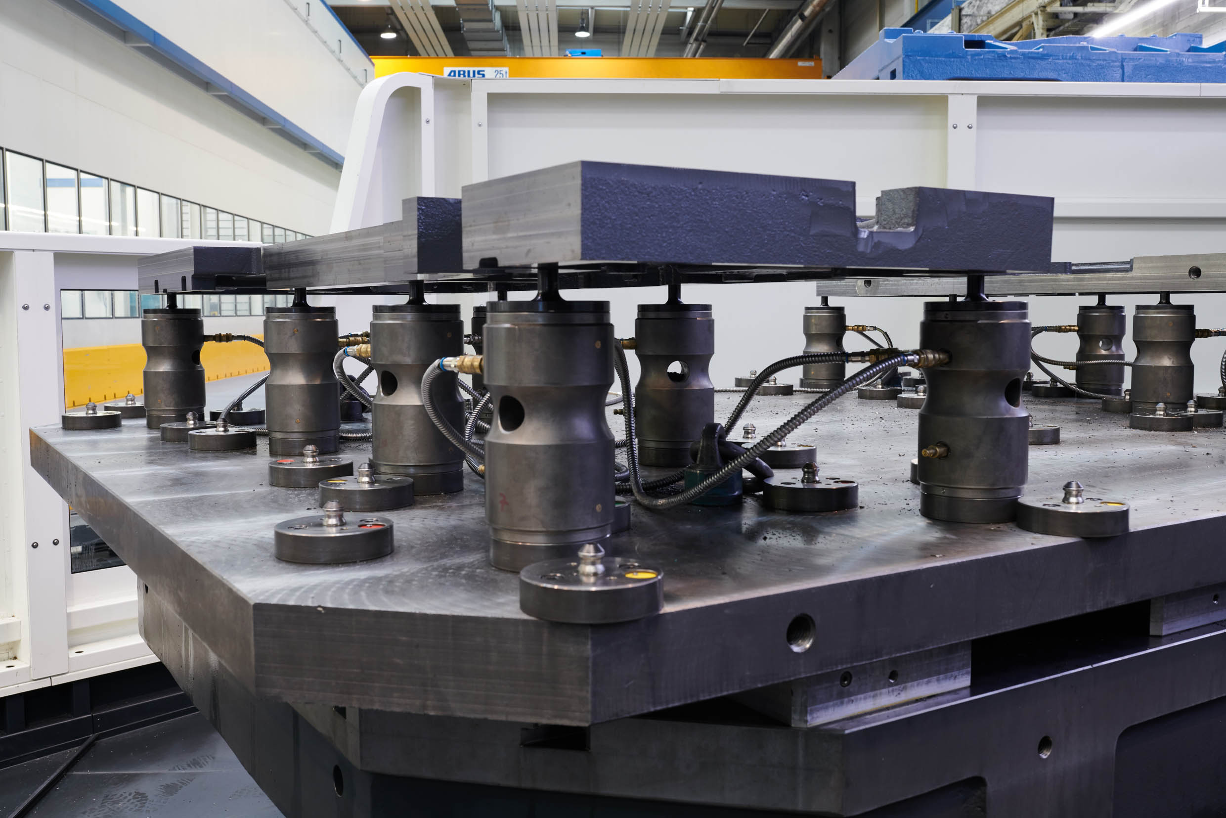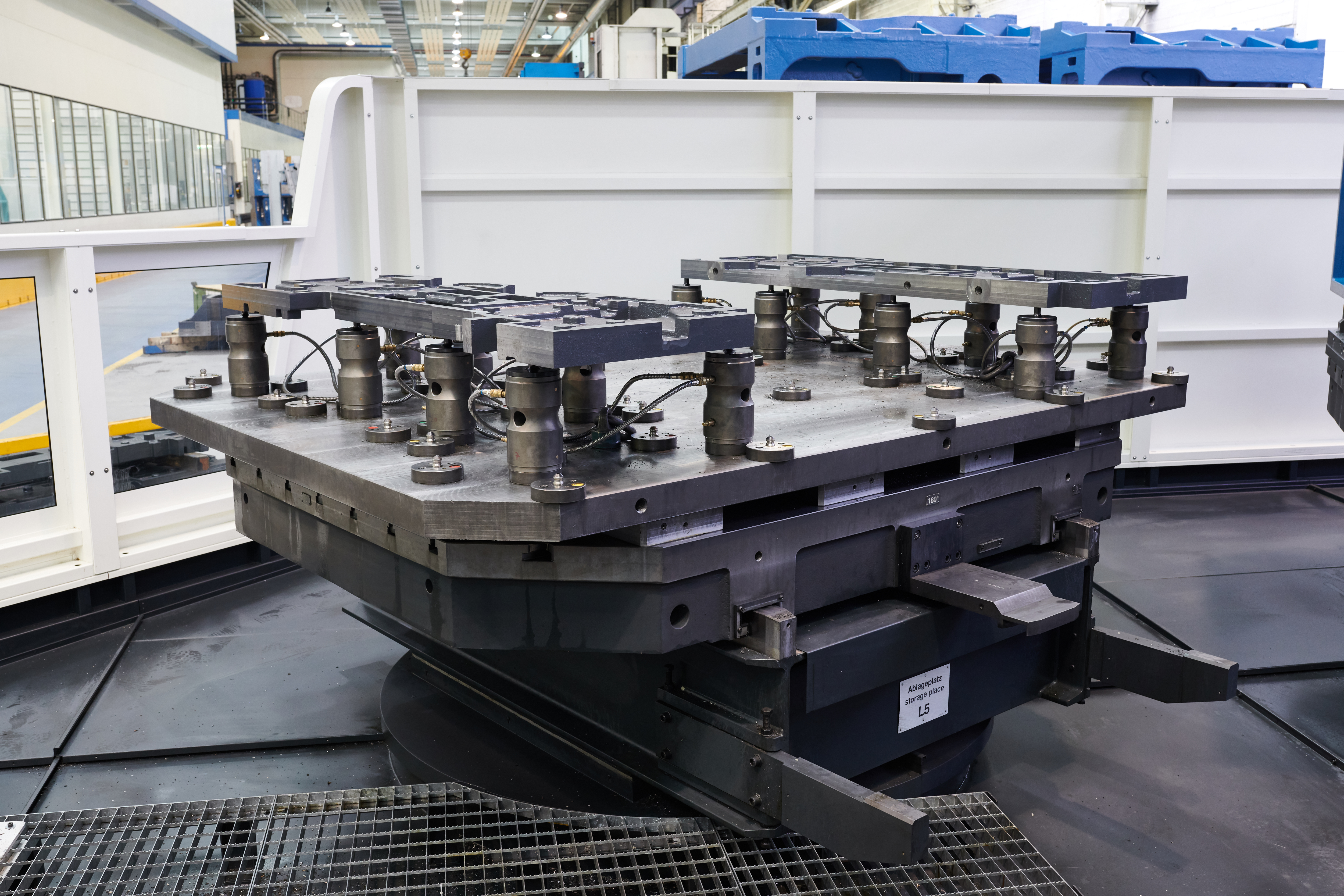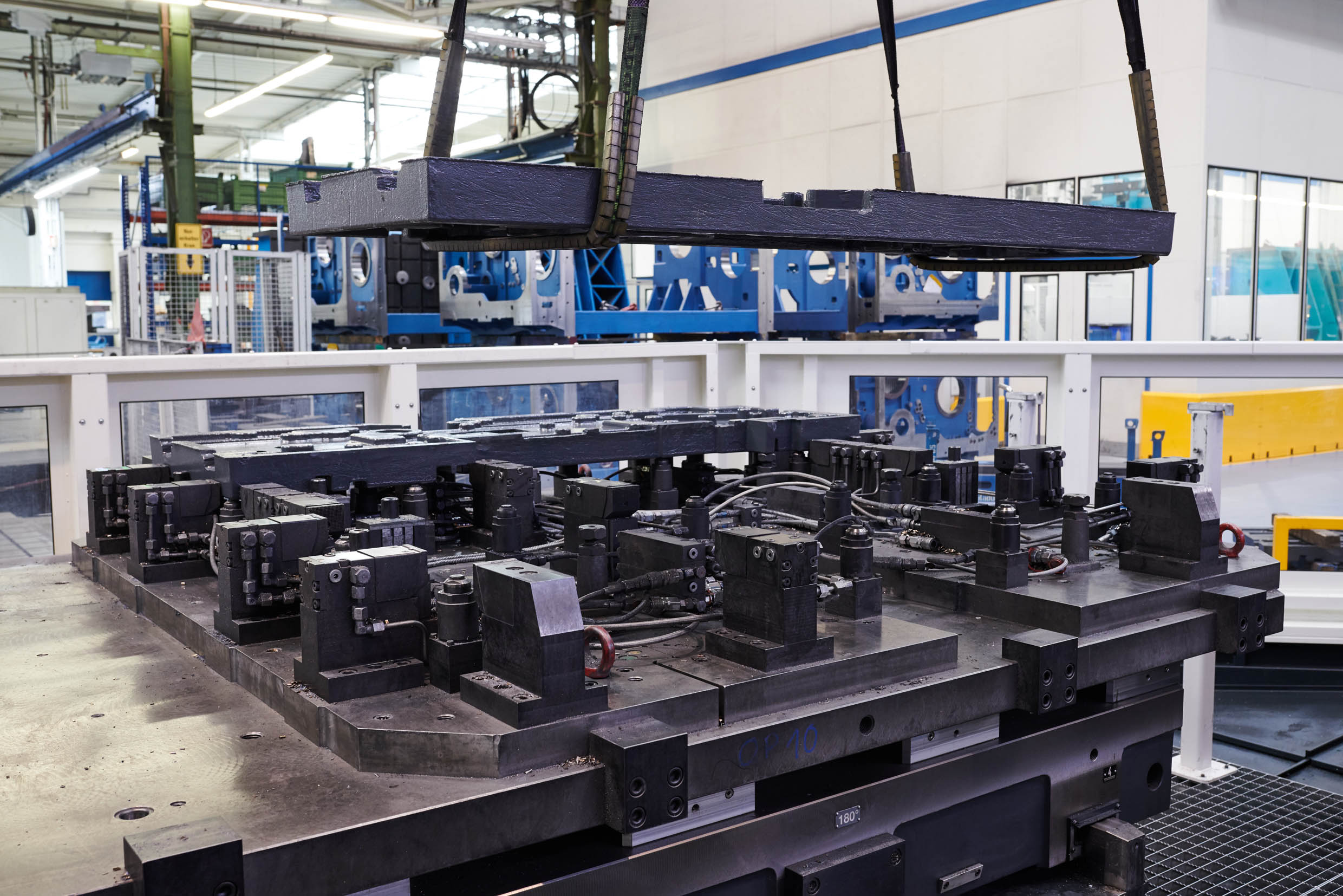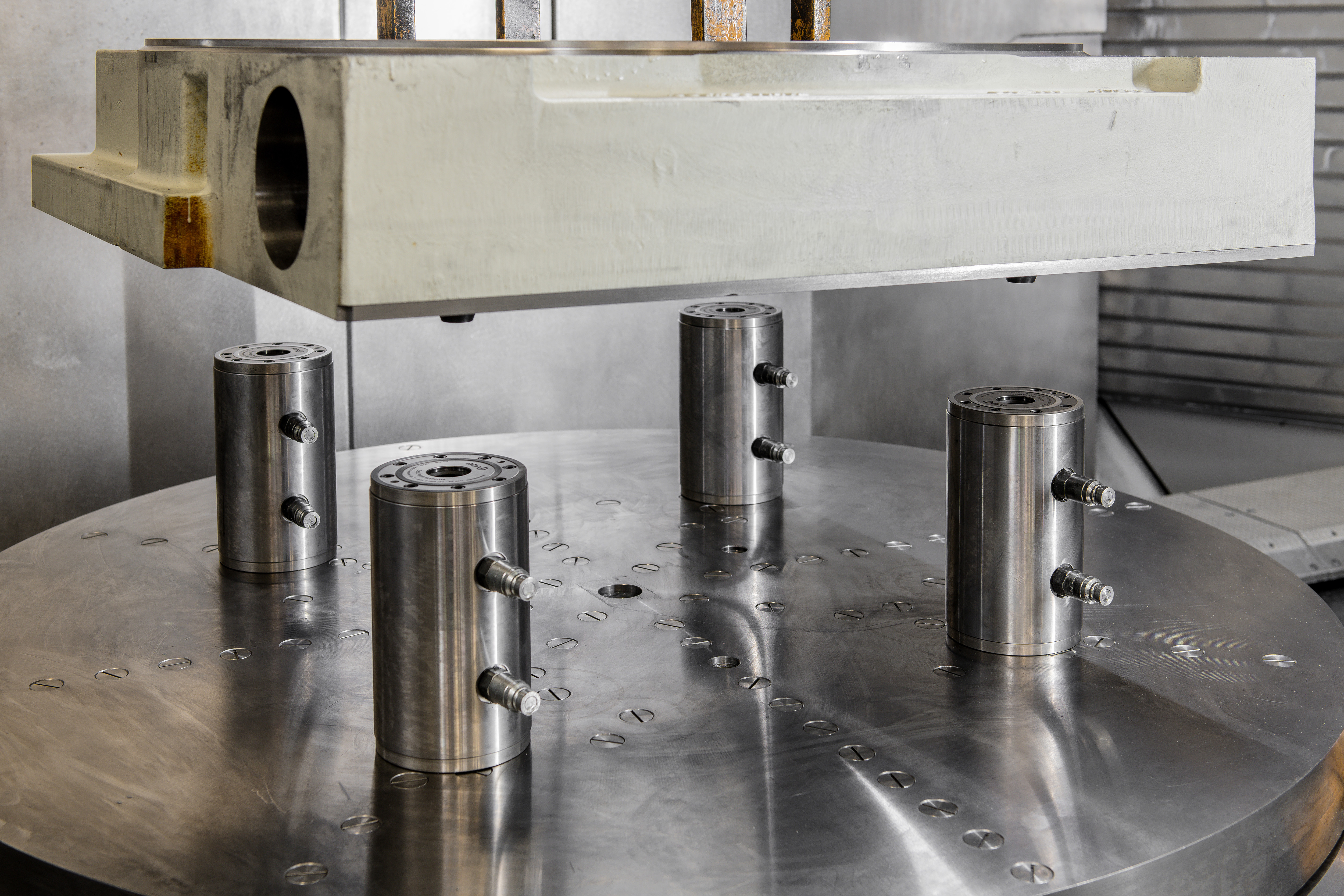 Flexible Aufspannvorrichtungen als Basis für vier Varianten sehr großer Maschinenteile, die paarweise aufgespannt und bearbeitet werden. Für die Fixierung in erster und zweiter Aufspannung sorgt eine Kombination aus hydraulischen Niederzugspannern, und anschwimmenden Unterstützungselementen.